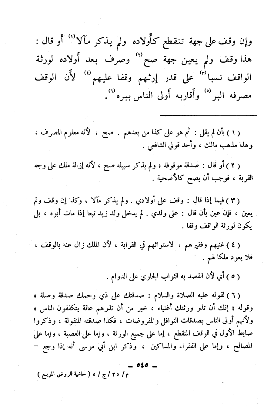 (¬6) لقوله عليه الصلاة والسلام «صدقتك على ذي رحمك صدقة وصلة» وقوله «إنك إن تذر ورثتك أغنياء، خير من أن تذرهم عالة يتكففون الناس» ولأنهم أولى الناس بصدقات النوافل والمفروضات، فكذا صدقته المنقولة، وذكروا ضابط الأول في الوقف المنقطع، إما على جميع الورثة، وإما على العصبة، وإما على المصالح، وإما على الفقراء والمساكين، وذكر ابن أبي موسى أنه إذا رجع
