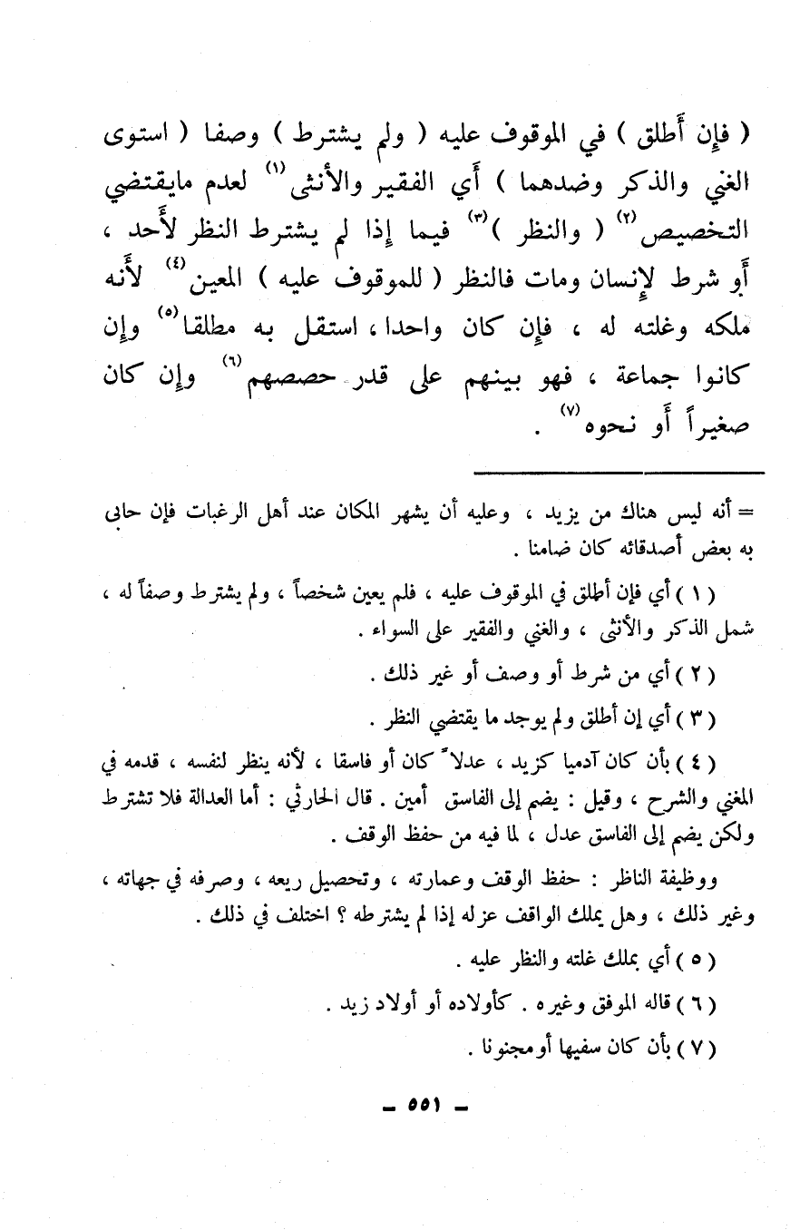 (فإن أطلق) في الموقوف عليه (ولم يشترط) وصفا (استوى الغني والذكر وضدهما) أي الفقير والأنثى (¬1) لعدم ما يقتضي التخصيص (¬2) (والنظر) (¬3) فيما إذا لم يشترط النظر لأحد، أو شرط لإنسان ومات فالنظر (للموقوف عليه) المعين (¬4) لأنه ملكه وغلته له، فإن كان واحدًا، استقل به مطلقًا (¬5) وإن كانوا جماعة، فهو بينهم على قدر حصصهم (¬6) وإن كان صغيرًا أو نحوه (¬7) .