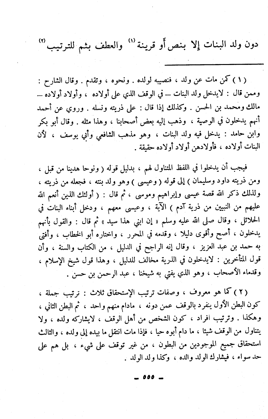(¬1) كمن مات عن ولد، فنصيبه لولده. ونحوه، وتقدم. وقال الشارح: وممن قال: لا يدخل ولد البنات – في الوقف الذي على أولاده، وأولاد أولاده – مالك ومحمد بن الحسن. وكذلك إذا قال: على ذريته ونسله. وروي عن أحمد أنهم يدخلون في الوصية، وذهب إليه بعض أصحابنا، وهذا مثله. وقال أبو بكر وابن حامد: يدخل فيه ولد البنات، وهو مذهب الشافعي وأبي يوسف، لأن البنات أولاده، فأولادهن أولاد أولاده حقيقة.