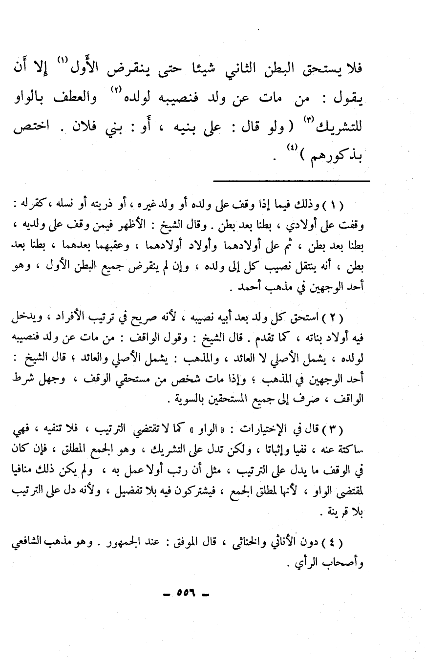 (¬3) قال في الاختيارات: "الواو" كما لا تقتضي الترتيب، فلا تنفيه، فهي ساكتة عنه، نفيا وإثباتا، ولكن تدل على التشريك، وهو الجمع المطلق، فإن كان في الوقف ما يدل على الترتيب، مثل أن رتب أو لا عمل به، ولم يكن ذلك منافيا لمقتضى الواو، لأنها لمطلق الجمع، فيشتركون فيه بلا تفضيل، ولأنه دل على الترتيب بلا قرينة.