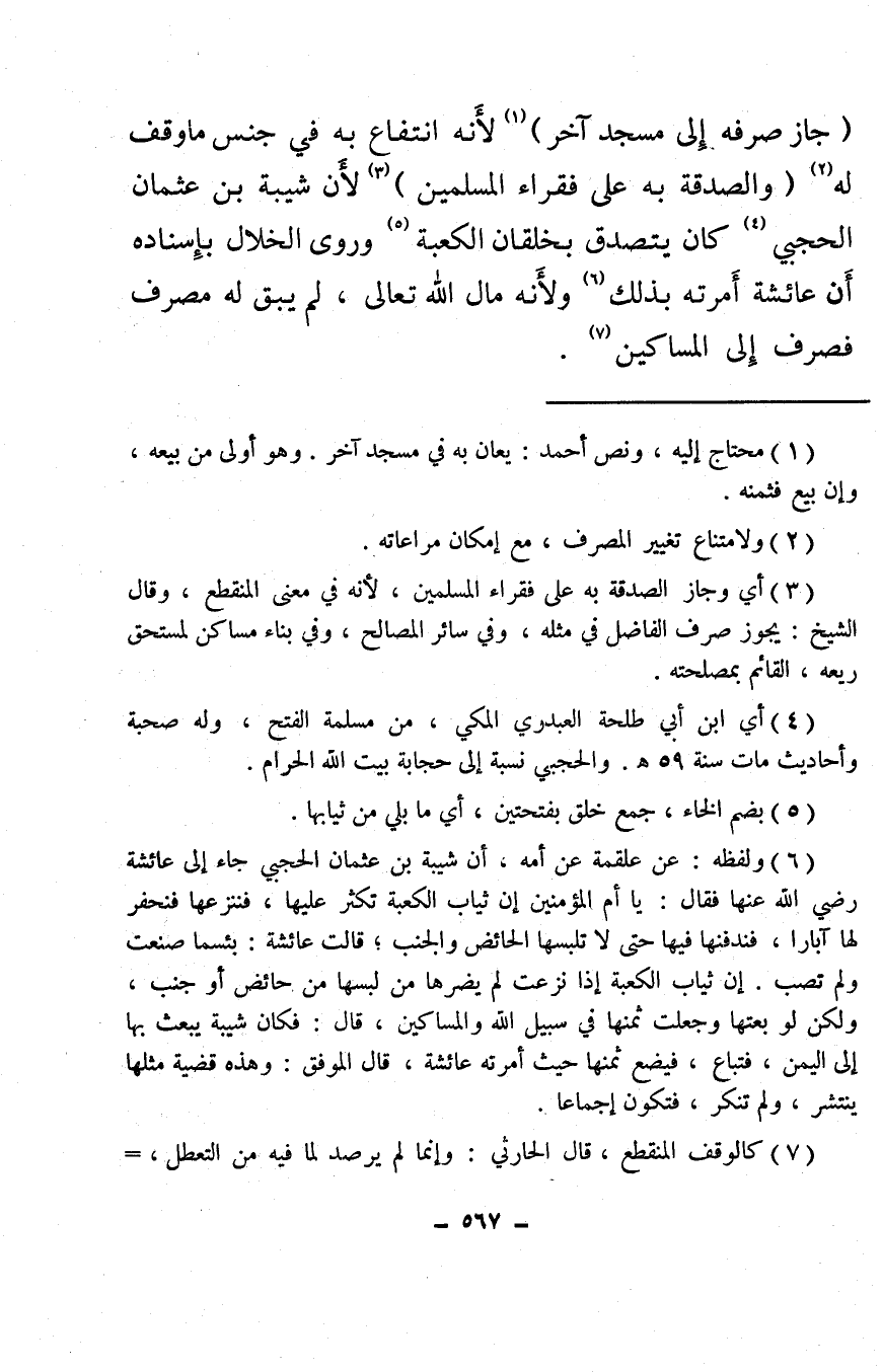 (¬6) ولفظه: عن علقمة عن أمه، أن شيبة بن عثمان الحجبي جاء إلى عائشة رضي الله عنها فقال: يا أم المؤمنين إن ثياب الكعبة تكثر عليها، فننزعها فنحفر لها آبارًا، فندفنها فيها حتى لا تلبسها الحائض والجنب؛ قالت عائشة: بئسما صنعت ولم تصب. إن ثياب الكعبة إذا نزعت لم يضرها من لبسها من حائض أو جنب، ولكن لو بعتها وجعلت ثمنها في سبيل الله والمساكين، قال: فكان شيبة يبعث بها إلى اليمن، فتباع، فيضع ثمنها حيث أمرته عائشة، قال الموفق: وهذه قضية مثلها ينتشر، ولم تنكر، فتكون إجماعًا.