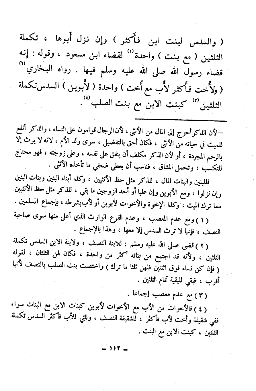 (¬4) فالأخوات من الأب مع الأخوات لأبوين كبنات الابن مع البنات سواء ففي شقيقة وأخت لأب فأكثر، للشقيقة النصف، وللتى للأب فأكثر السدس تكملة الثلثين، كبنت الابن مع البنت.