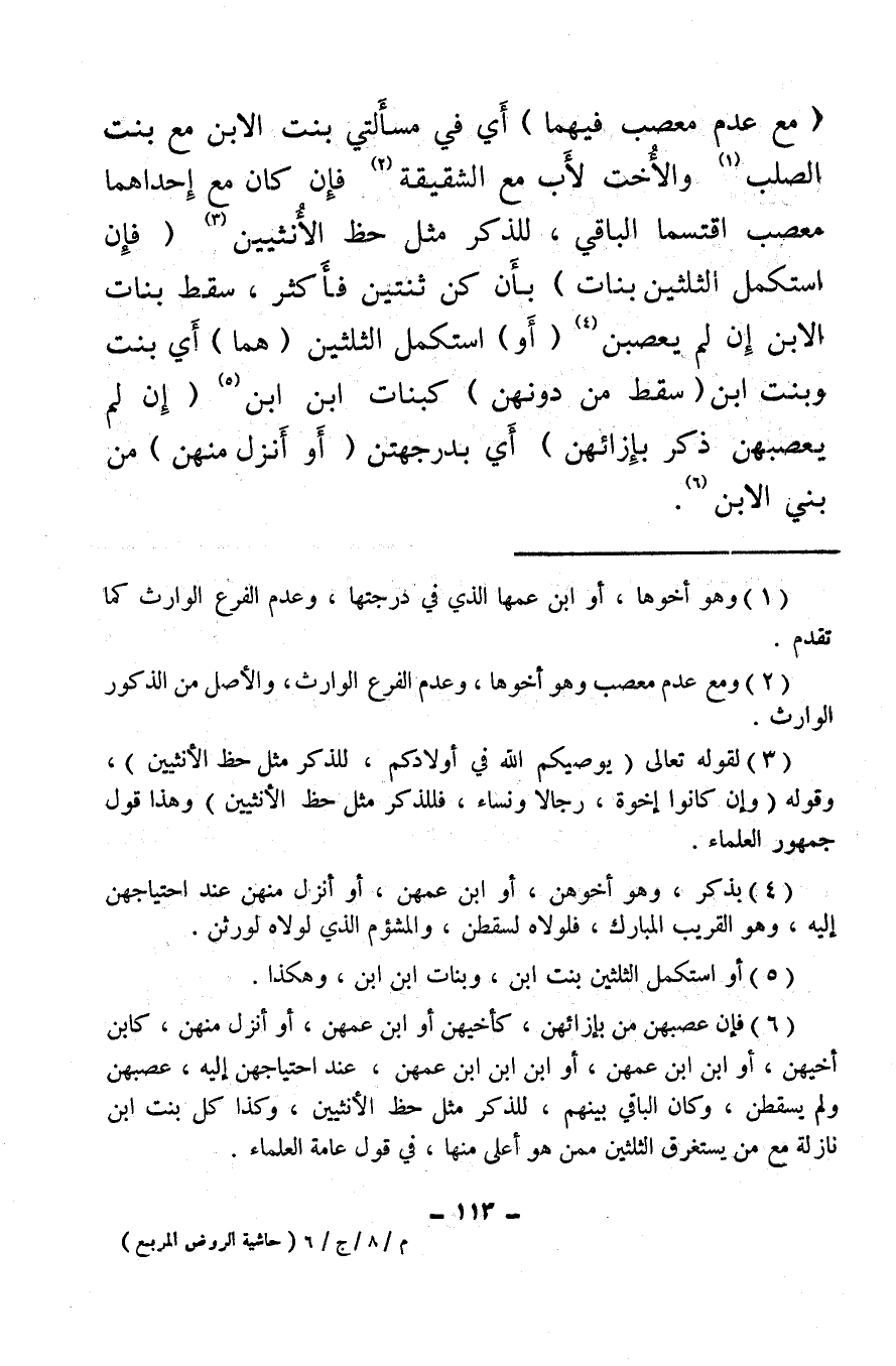 (¬6) فإن عصبهن من بإزائهن، كأخيهن أو ابن عمهن، أو أنزل منهن، كابن أخيهن، أو ابن ابن عمهن، أو ابن ابن ابن عمهن، عند احتياجهن إليه، عصبهن ولم يسقطن، وكان الباقي بينهم، للذكر مثل حظ الأنثيين، وكذا كل بنت ابن نازلة مع من يستغرق الثلثين ممن هو أعلى منها، في قول عامة العلماء.