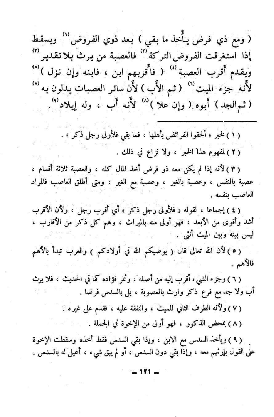 (¬3) لأنه إذا لم يكن معه ذو فرض أخذ المال كله، والعصبة ثلاثة أقسام، عصبة بالنفس، وعصبة بالغير، وعصبة مع الغير، ومتى أطلق العاصب فالمراد العاصب بنفسه.