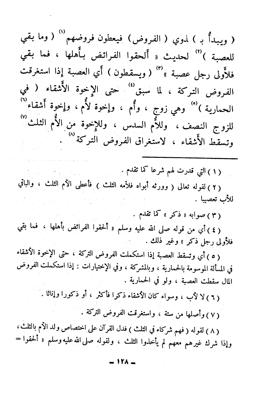 (¬5) أي وتسقط العصبة إذا استكملت الفروض التركة، حتى الإخوة الأشقاء في المسألة الموسومة بالحمارية، وبالمشركة، وفي الاختيارات: إذا استكملت الفروض المال سقطت العصبة، ولو في الحمارية.