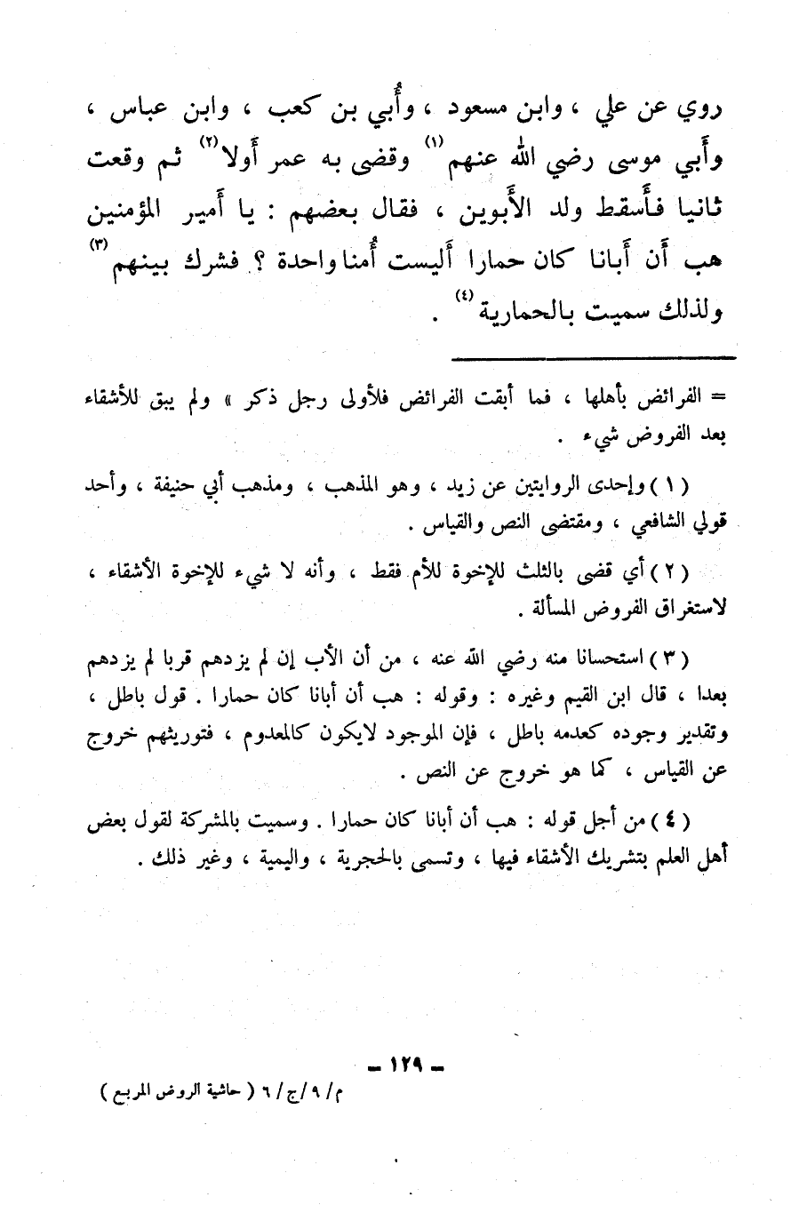 (¬4) من أجل قوله: هب أن أبانا كان حمارا. وسميت بالمشركة لقول بعض أهل العلم بتشريك الأشقاء فيها، وتسمى بالحجرية، واليمية، وغير ذلك.