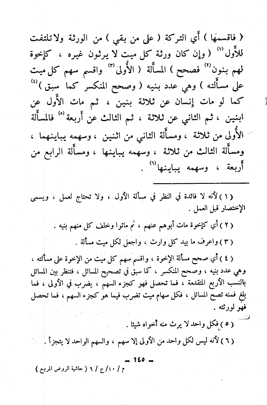 (¬4) أي صحح مسألة الإخوة، واقسم سهم كل ميت من الإخوة على مسألته، وهي عدد بنيه، وصحح المنكسر، كما سبق في تصحيح المسائل، فتنظر بين المسائل بالنسب الأربع المتقدمة، فما تحصل فهو كجزء السهم، يضرب في الأولى، فما بلغ فمنه تصح المسائل، فكل سهام ميت تضرب فيما هو كجزء السهم، فما تحصل فهو لورثته.