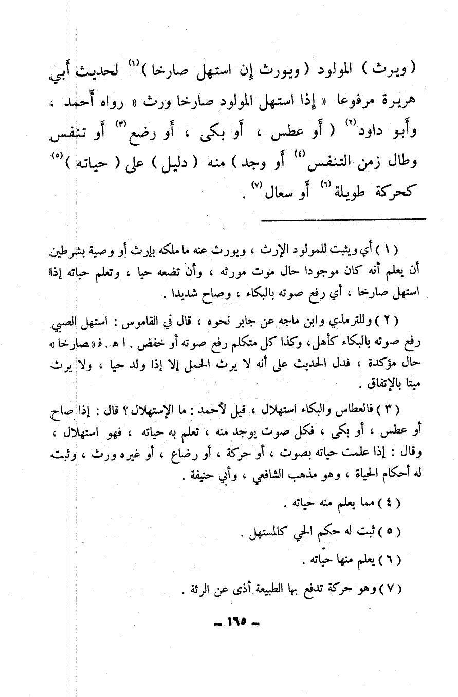 (¬2) وللترمذى وابن ماجه عن جابر نحوه، قال في القاموس: استهل الصبي رفع صوته بالبكاء كأهل، وكذا كل متكلم رفع صوته أو خفض. اهـ. فـ «ـصارخا» حال مؤكدة، فدل الحديث على أنه لا يرث الحمل إلا إذا ولد حيا، ولا يرث ميتا بالاتفاق.