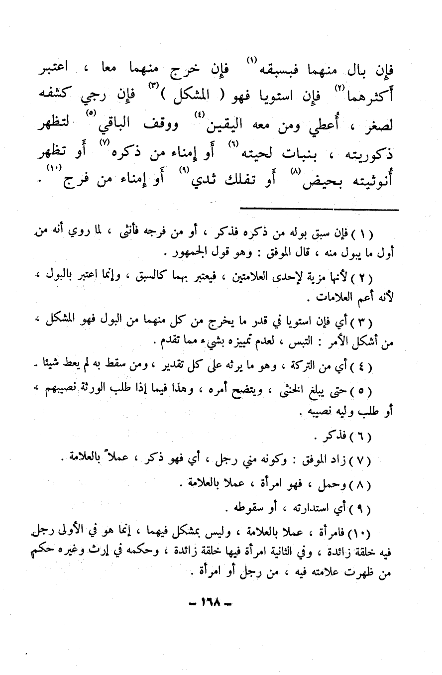 فإِن بال منهما فبسبقه (¬1) فإِن خرج منهما معا، اعتبر أَكثرهما (¬2) فإِن استويا فهو (المشكل) (¬3) فإِن رجى كشفه لصغر، أُعطي ومن معه اليقين (¬4) ووقف الباقي (¬5) لتظهر ذكوريته، بنبات لحيته (¬6) أَو إِمناء من ذكره (¬7) أَو تظهر أُنوثيته بحيض (¬8) أَو تفلك ثدى (¬9) أَو إِمناء من فرج (¬10) .