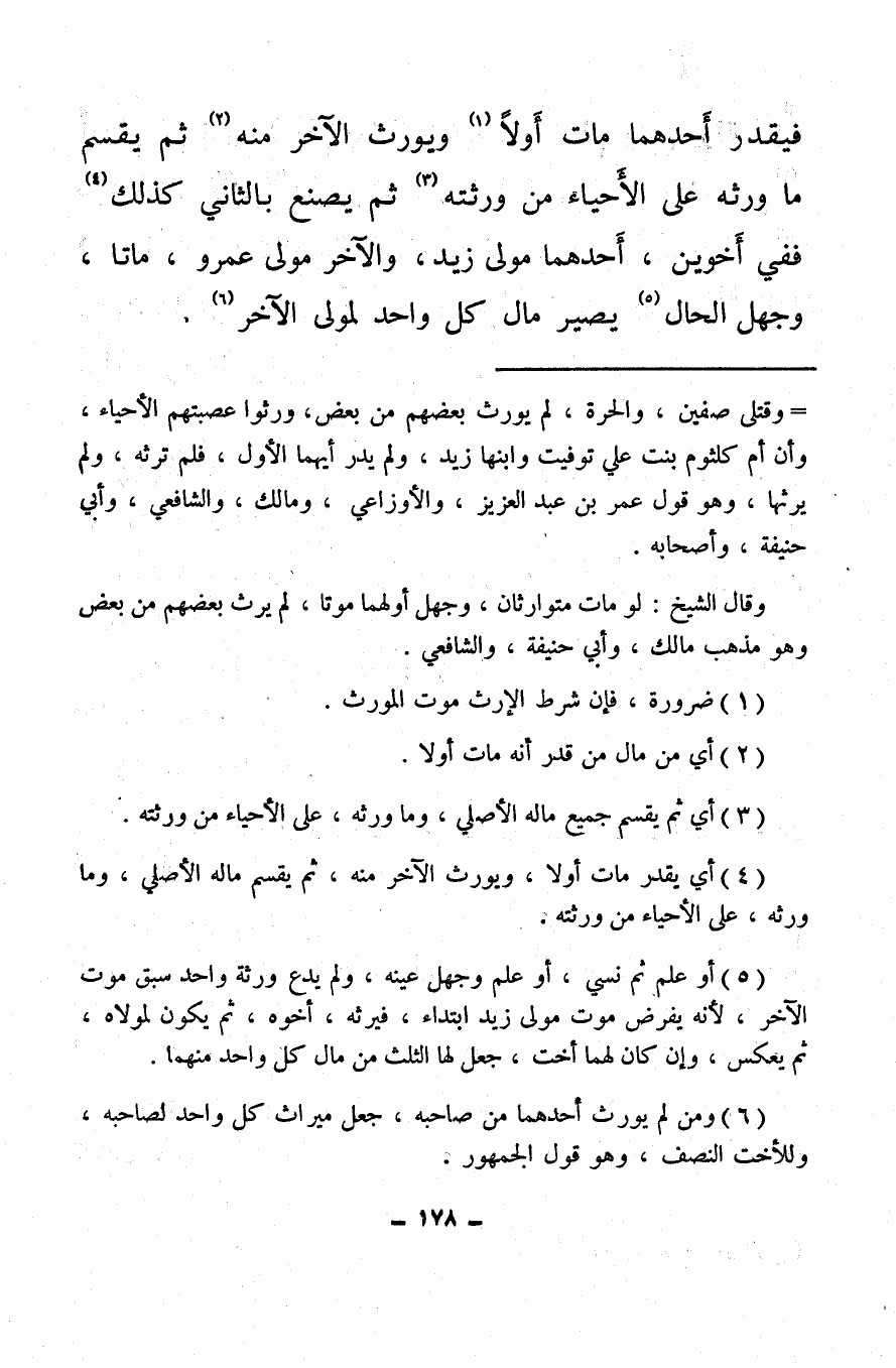 (¬4) أي يقدر مات أولا، ويورث الآخر منه، ثم يقسم ماله الأصلي، وما ورثه، على الأحياء من ورثته.