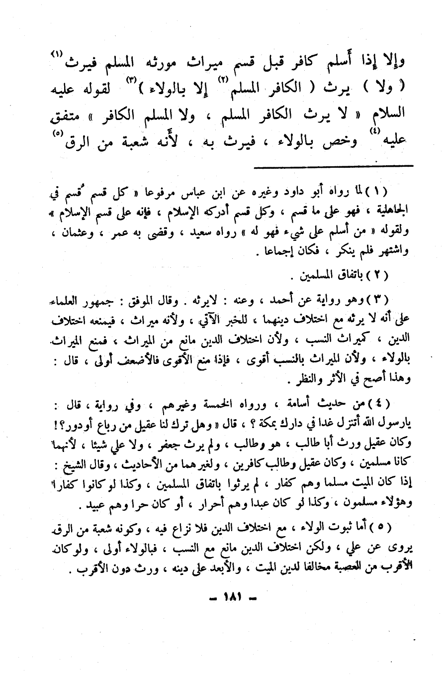 (¬4) من حديث أسامة، ورواه الخمسة وغيرهم، وفي رواية، قال: يا رسول الله أتنزل غدا في دارك بمكة؟، قال «وهل ترك لنا عقيل من رباع أو دور؟! وكان عقيل ورث أبا طالب، هو وطالب، ولم يرث جعفر، ولا على شيئا، لأنهما كانا مسلمين، وكان عقيل وطالب كافرين، ولغيرهما من الأحاديث، وقال الشيخ: إذا كان الميت مسلما وهم كفار، لم يرثوا باتفاق المسلمين، وكذا لو كانوا كفارا وهؤلاء مسلمون، وكذا لو كان عبدا وهم أحرار، أو كان حرا وهم عبيد.