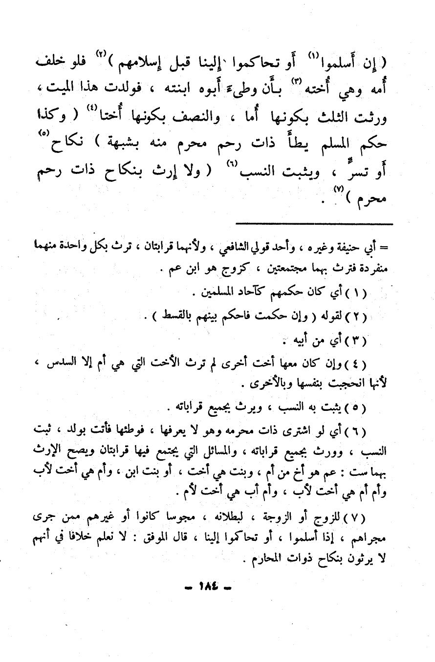 (إِن أَسلموا (¬1) أَو تحاكموا إِلينا قبل إِسلامهم) (¬2) فلو خلف أُمه وهي أُخته (¬3) بأَن وطىءَ أبوه ابنته، فولدت هذا الميت، ورثت الثلث بكونها أُما، والنصف بكونها أُختا (¬4) (وكذا حكم المسلم يطأَ ذات رحم محرم منه بشبهة) نكاح (¬5) أَو وتسرٍّ، ويثبت النسب (¬6) (ولا إِرث بنكاح ذات رحم محرم) (¬7) .