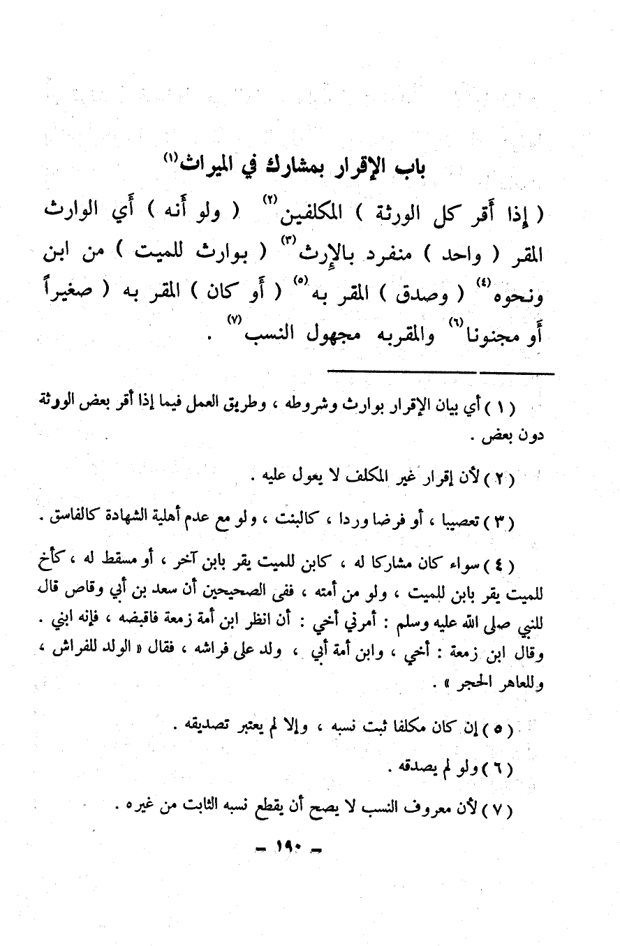 (¬1) أي بيان الإقرار بوارث وشروطه، وطريق العمل فيما إذا أقر بعض الورثة دون بعض.