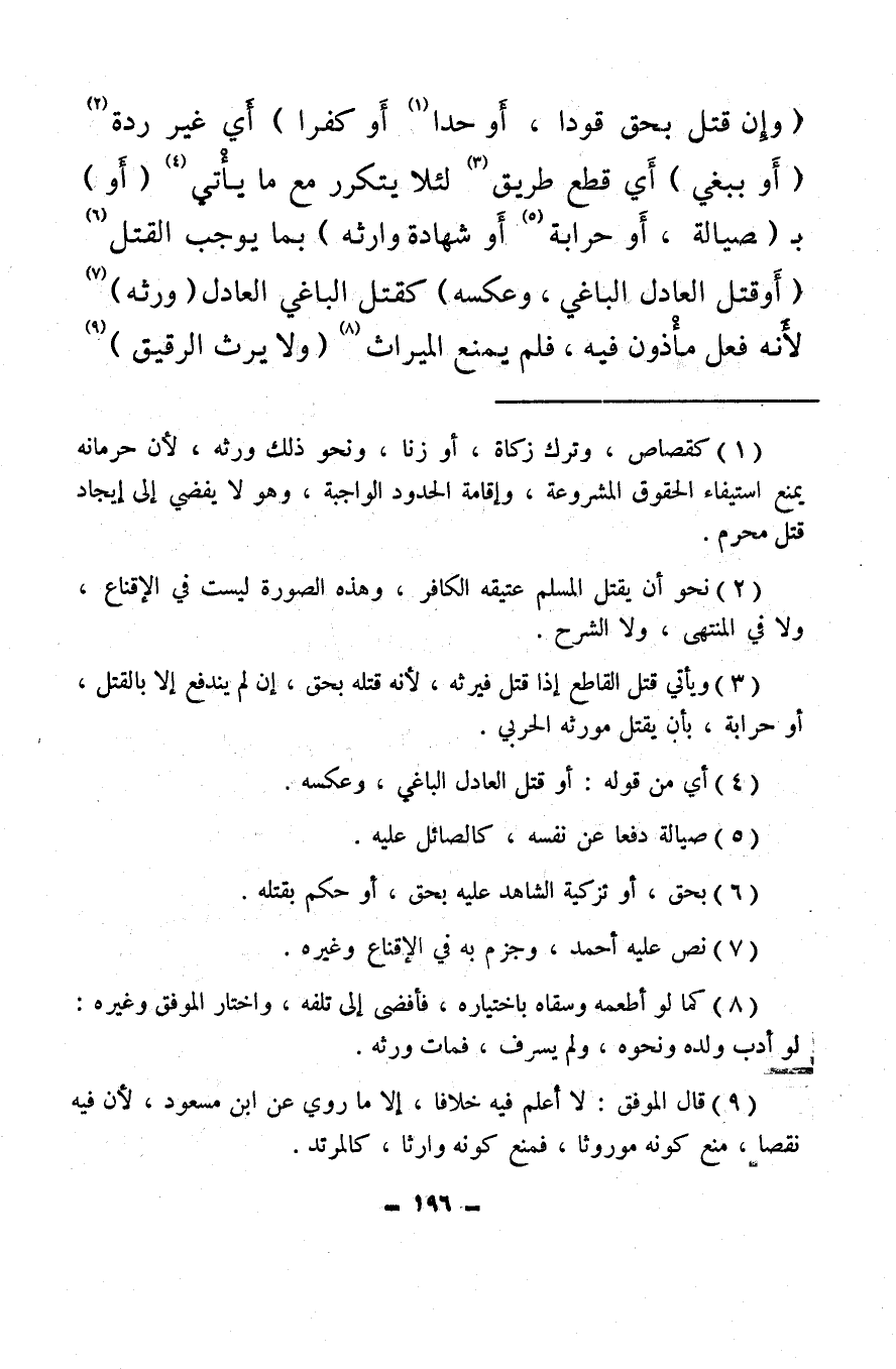 (وإِن قتل بحق قودا، أو حدا (¬1) أَو كفرا) أي غير ردة (¬2) (أَو ببغي) أي قطع طريق (¬3) لئلا يتكرر مع ما يأْتى (¬4) (أَو) بـ (ـصيالة، أَو حرابة (¬5) أَو شهادة وارثه) بما يوجب القتل (¬6) (أَو قتل العادل الباغي، وعكسه) كقتل الباغي العادل (ورثه) (¬7) لأَنه فعل مأْذون فيه، فلم يمنع الميراث (¬8) (ولا يرث الرقيق) (¬9)