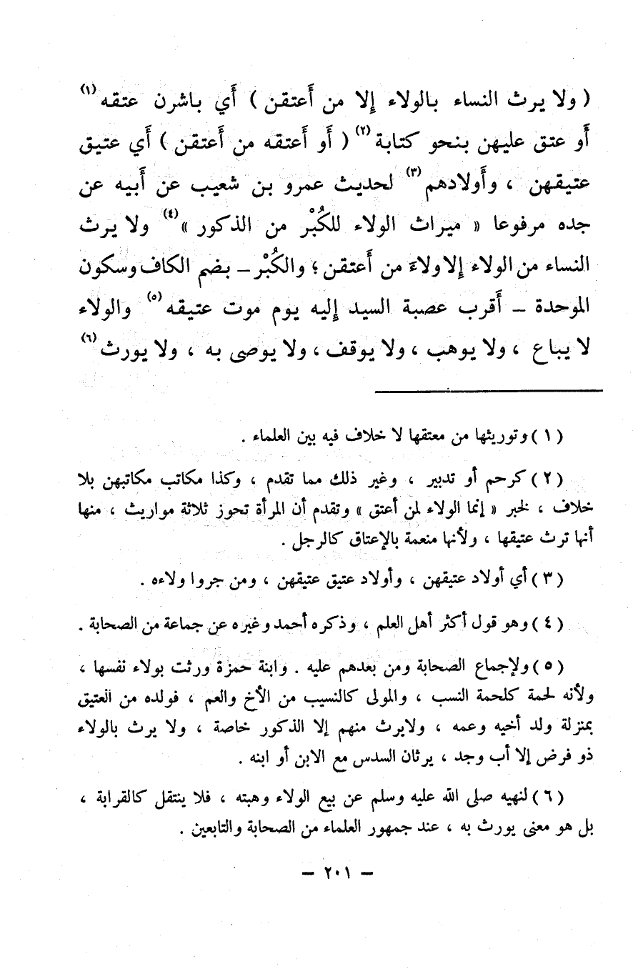 (¬6) لنهيه صلى الله عليه وسلم عن بيع الولاء وهبته، فلا ينتقل كالقرابة، بل هو معنى يورث به، عند جمهور العلماء من الصحابة والتابعين.