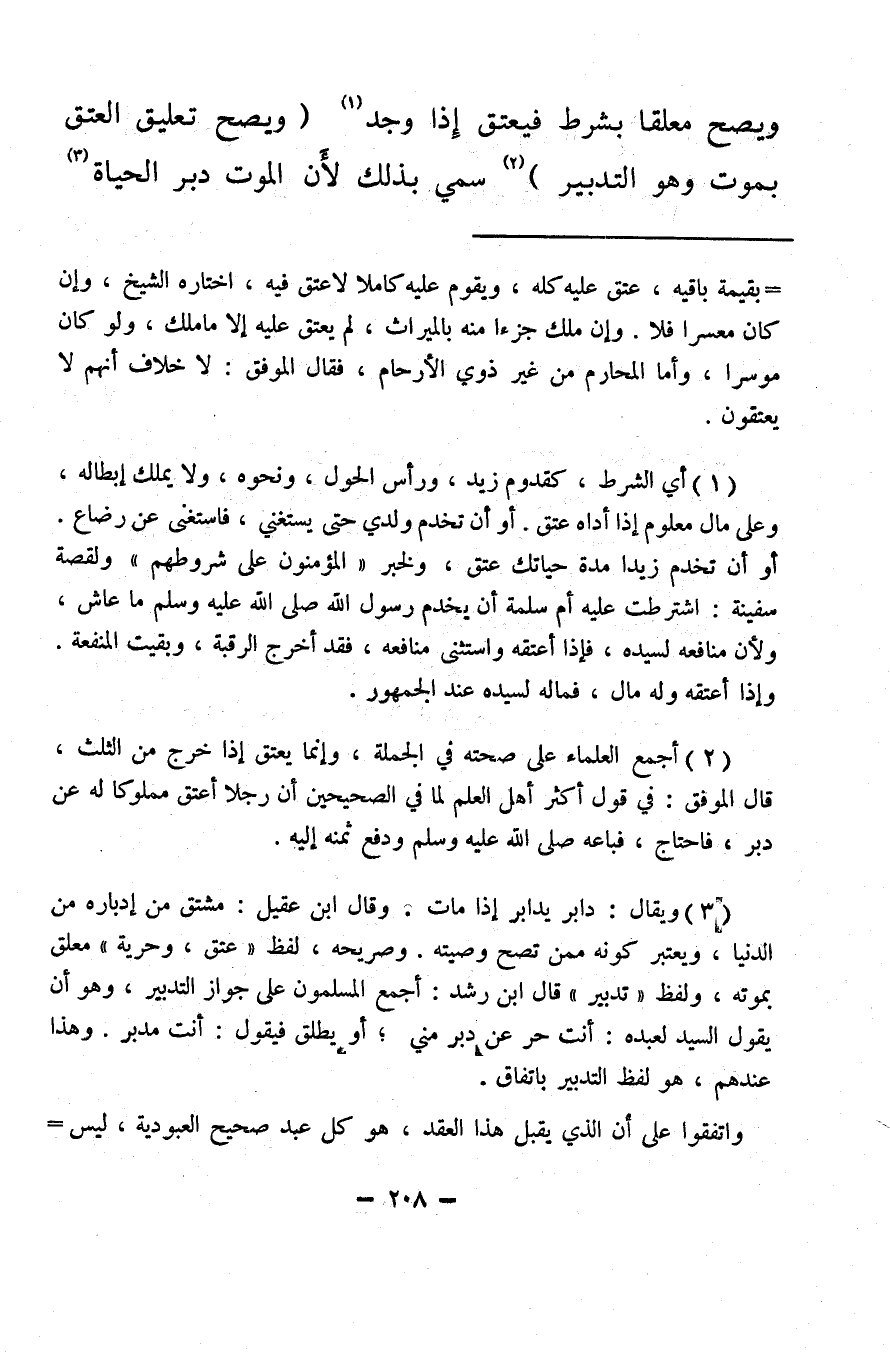 (¬3) ويقال: دابر يدابر إذا مات. وقال ابن عقيل: مشتق من إدباره من الدنيا، ويعتبر كونه ممن تصح وصيته. وصريحه، لفظ «عتق، وحرية» معلق بموته، ولفظ «تدبير» قال ابن رشد: أجمع المسلمون على جواز التدبير، وهو أن يقول السيد لعبده: أنت حر عن دبر مني؛ أو يطلق فيقول: أنت مدبر. وهذا عندهم، وهو لفظ التدبير باتفاق.