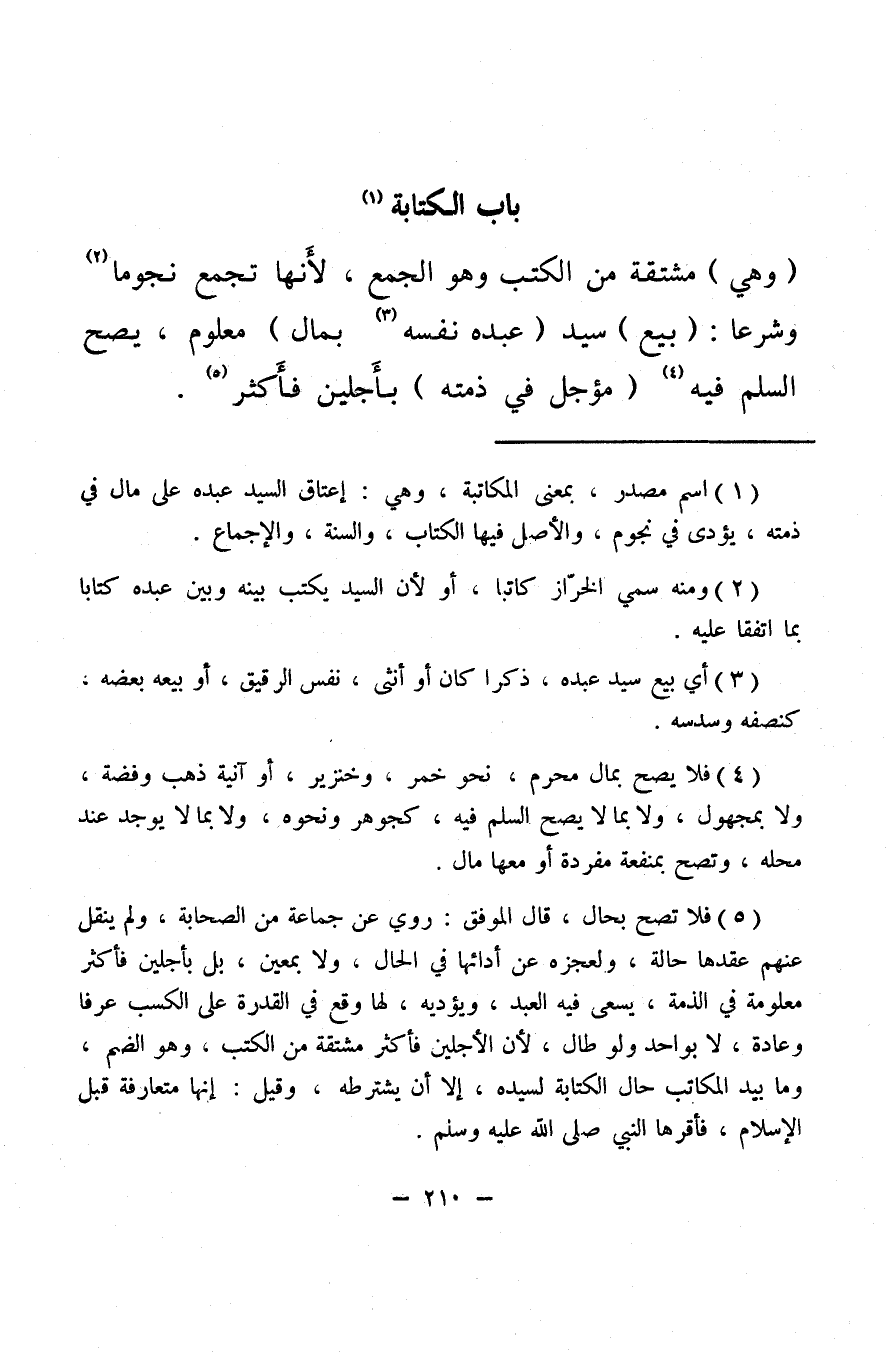 (وهي) مشتقة من الكتب وهو الجمع، لأَنها تجمع نجوما (¬2) وشرعا: (بيع) سيد (عبده نفسه (¬3) بمال) معلوم، يصح السلم فيه (¬4) (مؤجل في ذمته) بأَجلين فأَكثر (¬5) .