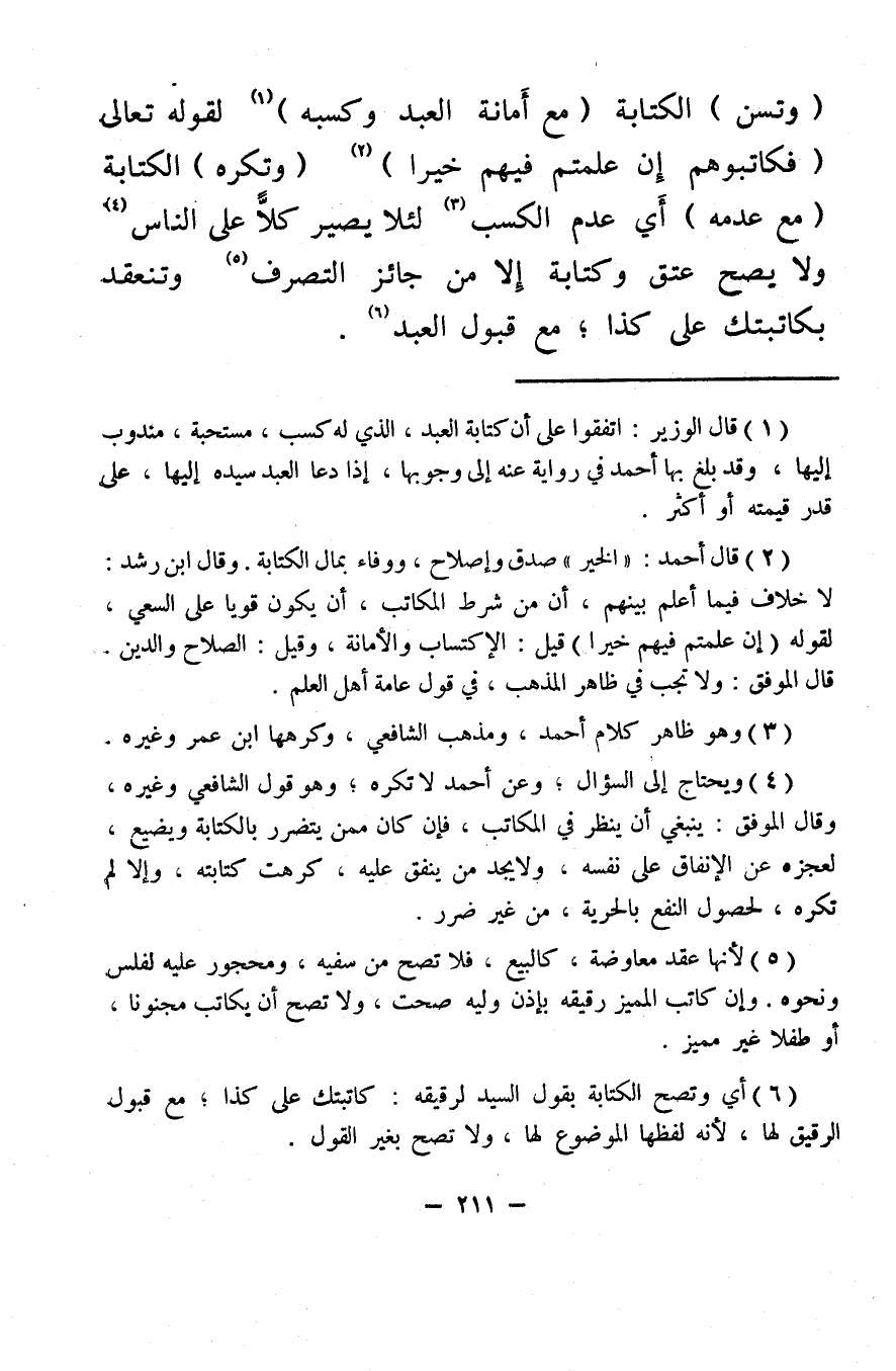 (¬1) قال الوزير: اتفقوا على أن كتابة العبد، الذي له كسب، مستحبة، مندوب إليها، وقد بلغ بها أحمد في رواية عنه إلى وجوبها، إذا دعا العبد سيده إليها، على قدر قيمته أو أكثر.