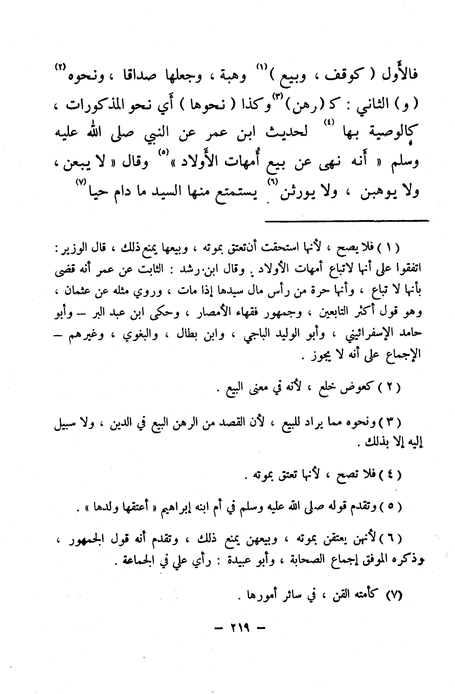 (¬1) فلا يصح، لأنها استحقت أن تعتق بموته، وبيعها يمنع ذلك، قال الوزير: اتفقوا على أنها لا تباع أمهات الأولاد. وقال ابن رشد: الثابت عن عمر أنه قضى بأنها لا تباع، وأنها حرة من رأس مال سيدها إذا مات، وروي مثله عن عثمان، وهو قول أكثر التابعين، وجمهور فقهاء الأمصار، وحكى ابن عبد البر - وأبو حامد الإسفرائيني، وأبو الوليد الباجي، وابن بطال، والبغوي، وغيرهم - الإجماع على أنه لا يجوز.