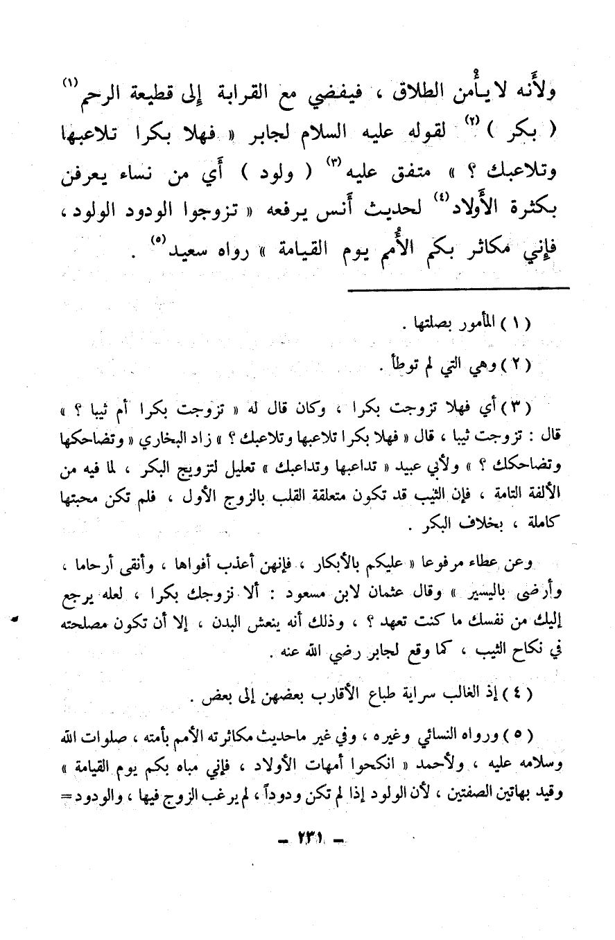 (¬5) ورواه النسائى وغيره، وفي غير ما حديث مكاثرته الأمم بأمته، صلوات الله وسلامه عليه، ولأحمد «انكحوا أمهات الأولاد، فإني مباه بكم يوم القيامة» وقيد