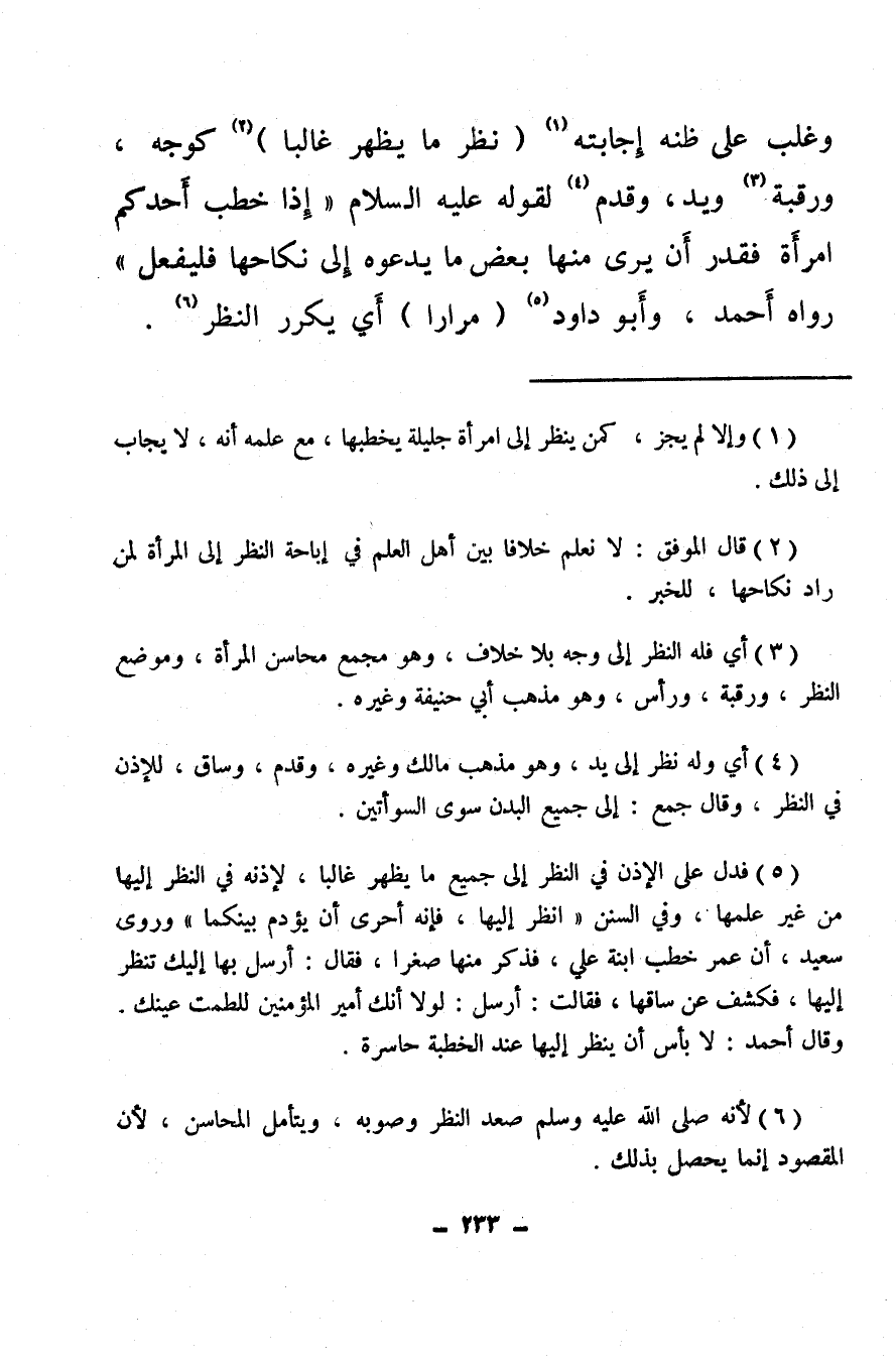 (¬2) قال الموفق: لا نعلم خلافا بين أهل العلم في إباحة النظر إلى المرأة لمن أراد نكاحها، للخبر.