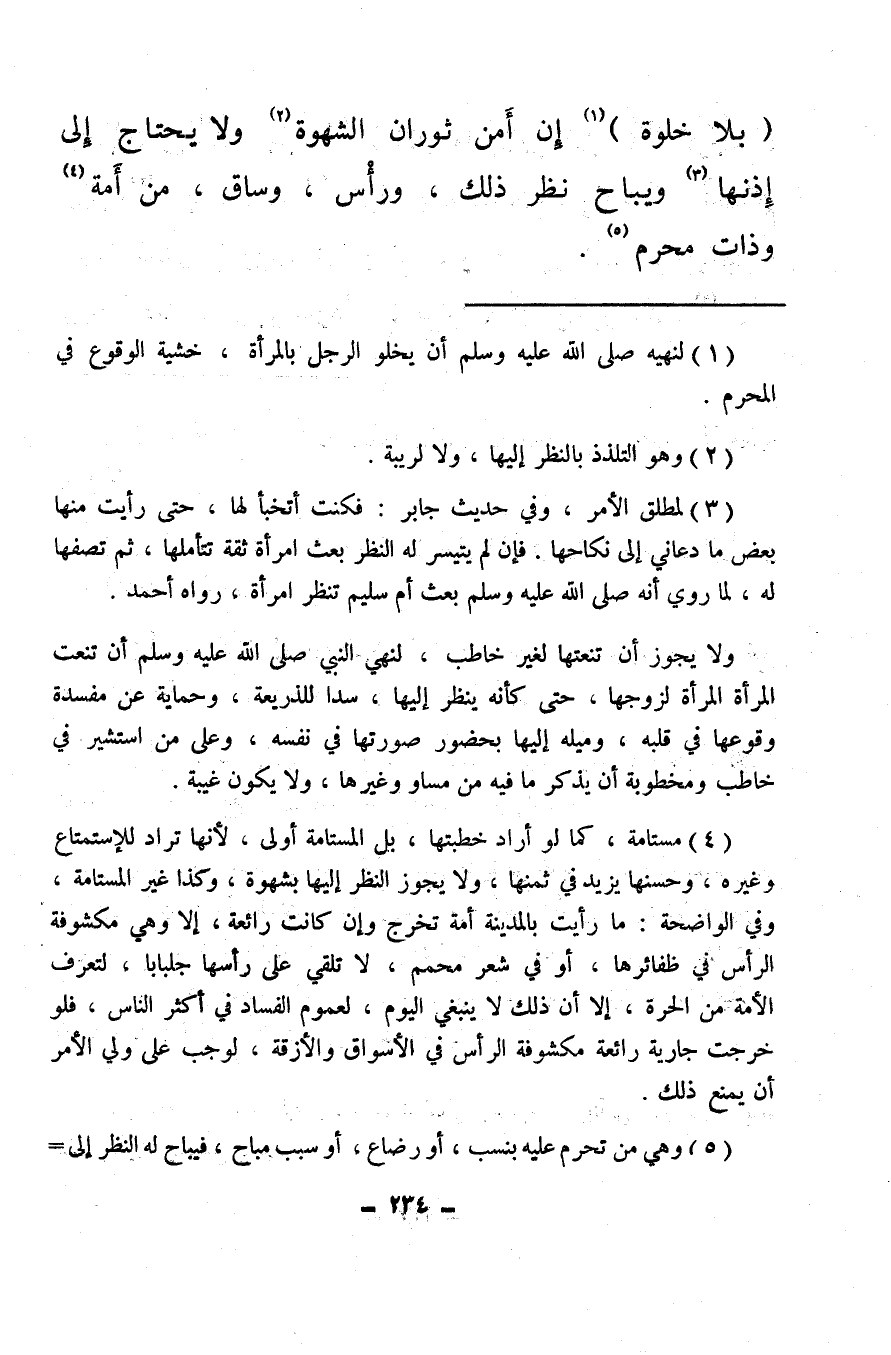 (¬4) مستامة، كما لو أراد خطبتها، بل المستامة أولي، لأنها تراد للاستمتاع وغيره، وحسنها يزيد في ثمنها، ولا يجوز النظر إليها بشهوة، وكذا غير المستامة، وفي الواضحة: ما رأيت بالمدينة أمة تخرج وإن كانت رائعة، إلا وهي مكشوفة الرأس في ظفائرها، أو في شعر محمم، لا تلقي على رأسها جلبابا، لتعرف الأمة من الحرة، إلا أن ذلك لا ينبغي اليوم، لعموم الفساد في أكثر الناس، فلو خرجت جارية رائعة مكشوفة الرأس في الأسواق والأزقة، لوجب على ولي الأمر أن يمنع ذلك.