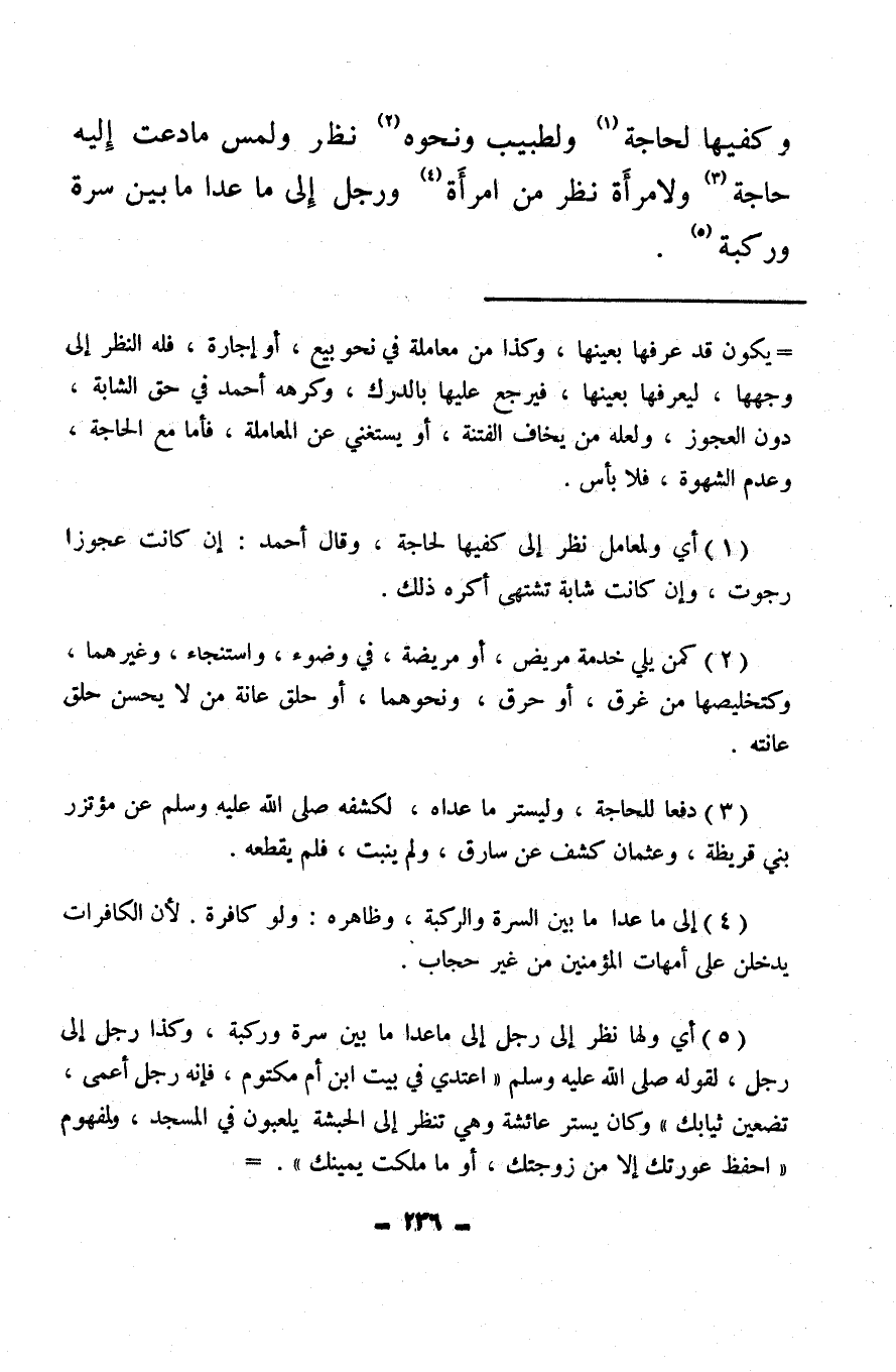 (¬3) دفعا للحاجة، وليستر ما عداه، لكشفه صلى الله عليه وسلم عن مؤتزر بني قريظة، وعثمان كشف عن سارق، ولم ينبت، فلم يقطعه.