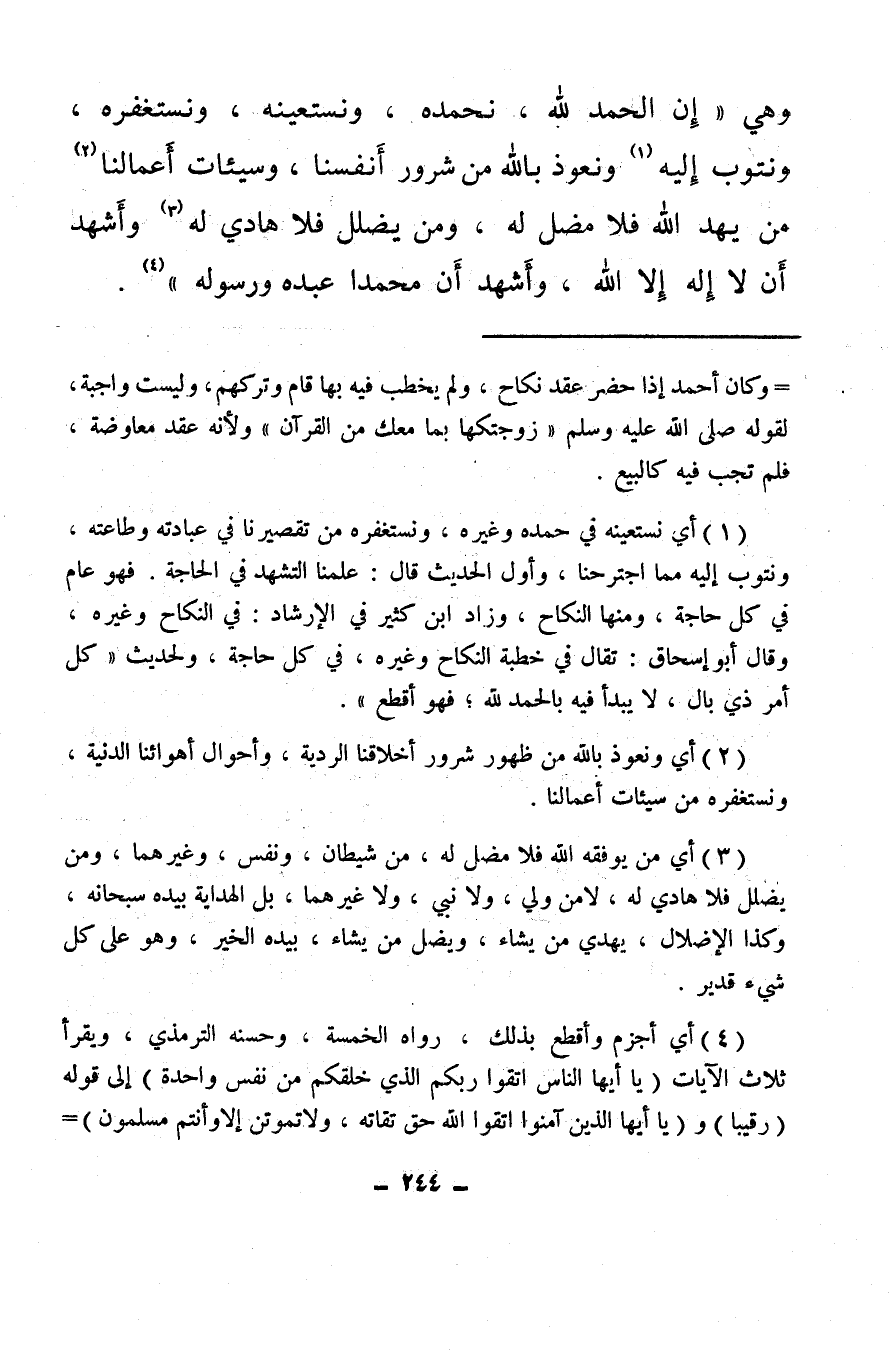 (¬1) أي نستعينه في حمده وغيره، ونستغفره من تقصيرنا في عبادته وطاعته، ونتوب إليه مما اجترحنا، وأول الحديث قال: علمنا التشهد في الحاجة. فهو عام في كل حاجة، ومنها النكاح، وزاد ابن كثير في الإرشاد: في النكاح وغيره، وقال أبو إسحاق: تقال في خطبة النكاح وغيره، في كل حاجة، ولحديث «كل أمر ذى بال، لا يبدأ فيه بالحمد لله؛ فهو أقطع» .