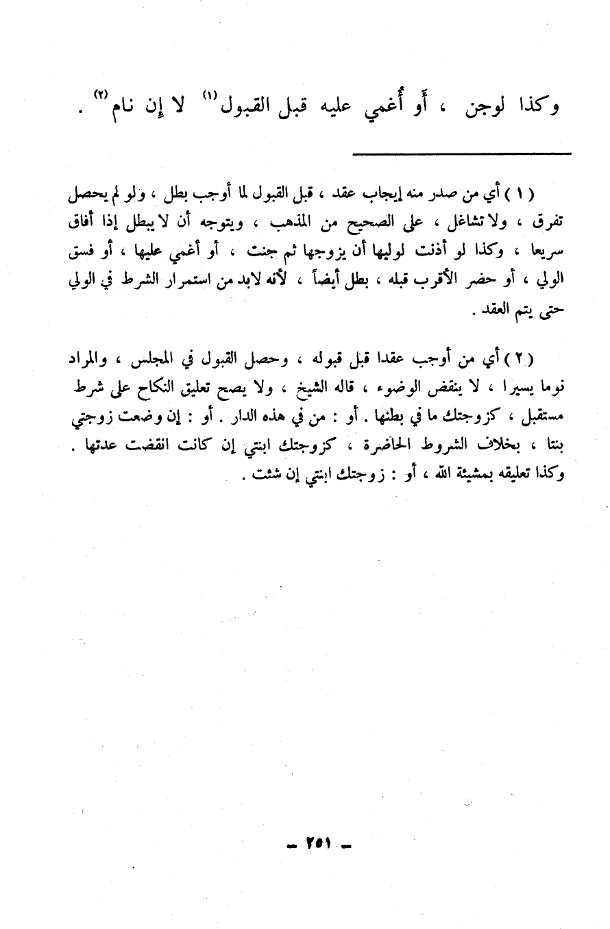 (¬1) أي من صدر منه إيجاب عقد، قبل القبول لما أوجب بطل، ولو لم يحصل تفرق، ولا تشاغل، على الصحيح من المذهب، ويتوجه أن لا يبطل إذا أفاق سريعا، وكذا لو أذنت لوليها أن يزوجها ثم جنت، أو أغمي عليها، أو فسق الولي، أو حضر الأقرب قبله، بطل أيضًا، لأَنه لا بد من استمرار الشرط في الولي حتى يتم العقد.
