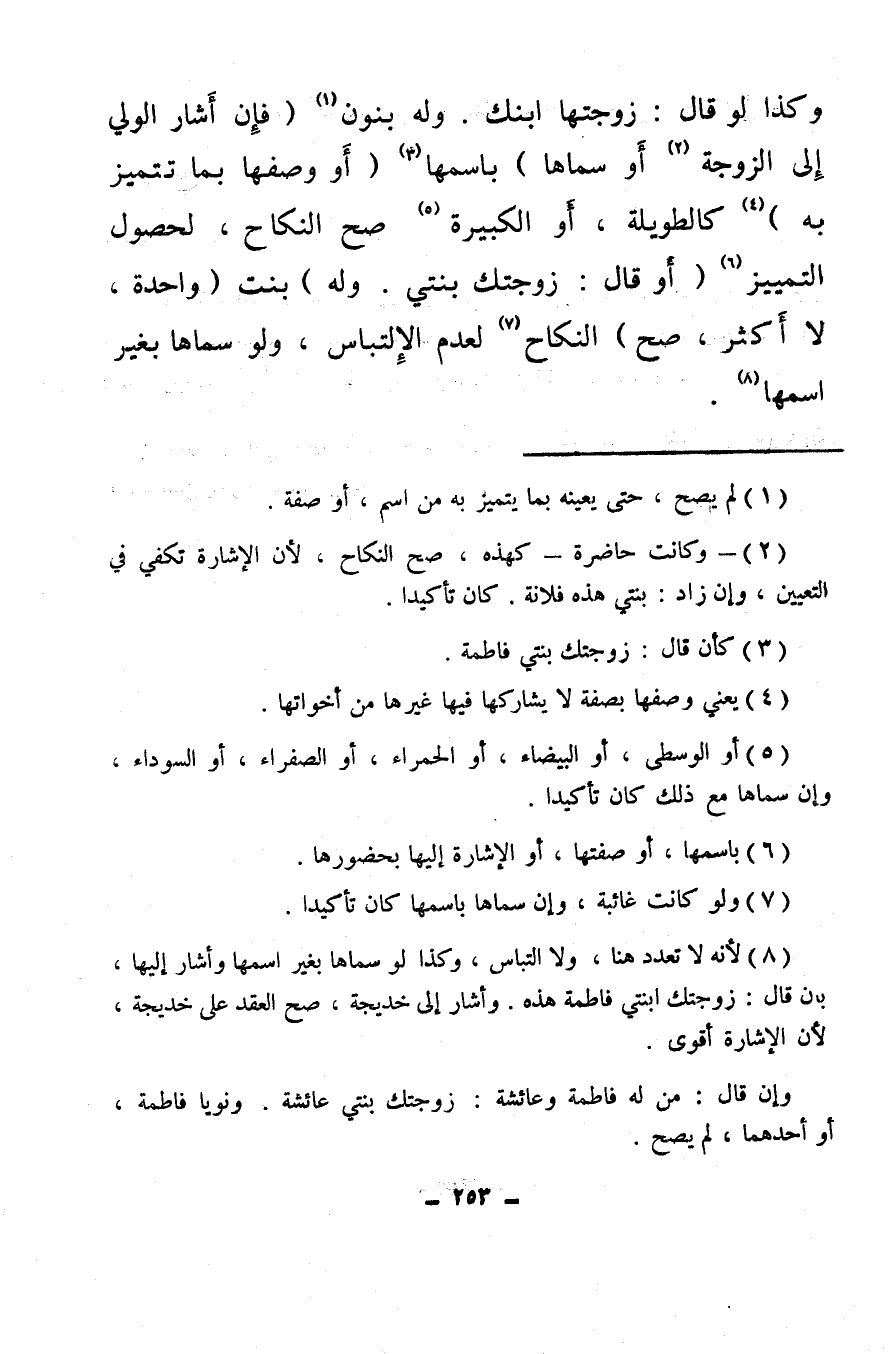 (¬8) لأنه لا تعدد هنا، ولا التباس، وكذا لو سماها بغير اسمها وأشار إليها، بأن قال: زوجتك ابنتى فاطمة هذه. وأشار إلى خديجة، صح العقد على خديجة، لأن الإشارة أقوى.