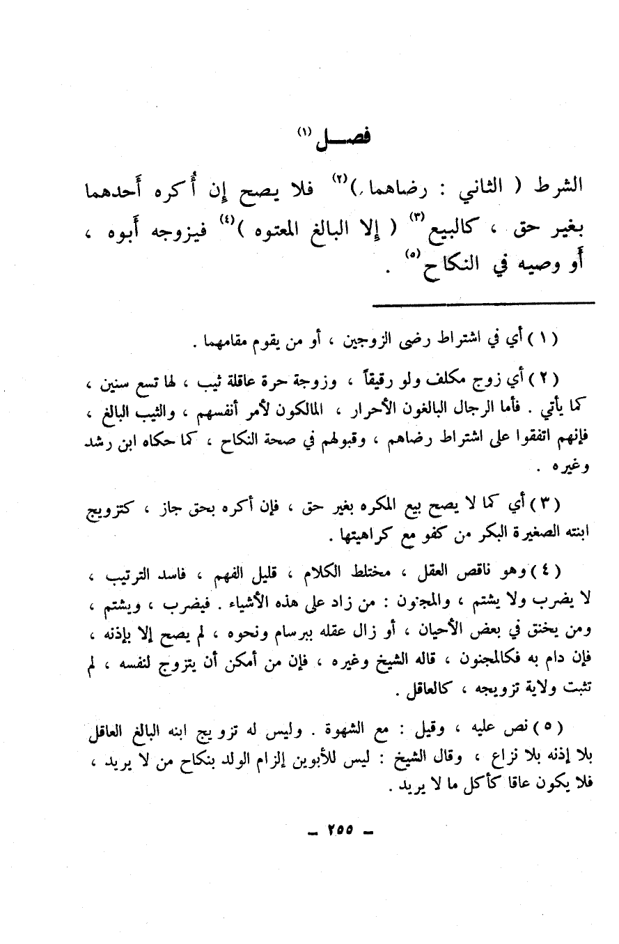الشرط (الثاني: رضاهما) (¬2) فلا يصح إِن أُكره أَحدهما بغير حق، كالبيع (¬3) (إِلا البالغ المعتوه) (¬4) فيزوجه أَبوه، أَو وصيه في النكاح (¬5) .
