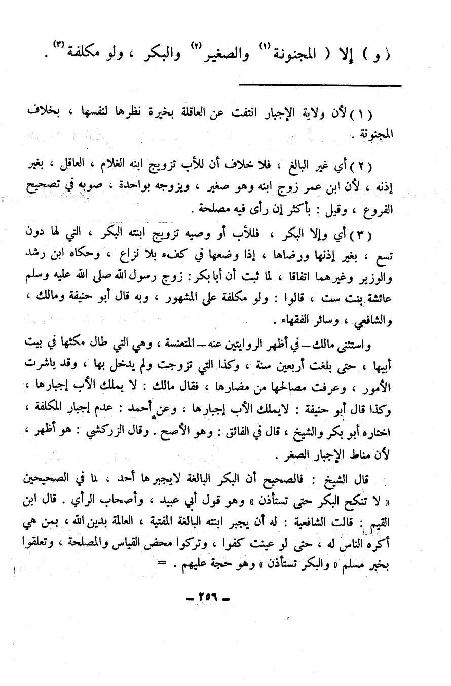 (¬3) أي وإلا البكر، فللأب أو وصيه تزويج ابنته البكر، التي لها دون تسع، بغير إذنها ورضاها، إذا وضعها في كفء بلا نزاع، وحكاه ابن رشد والوزير وغيرهما اتفاقا، لما ثبت أن أبا بكر: زوج رسول الله صلى الله عليه وسلم عائشة بنت ست، قالوا: ولو مكلفة على المشهور، وبه قال أبو حنيفة ومالك، والشافعي، وسائر الفقهاء.