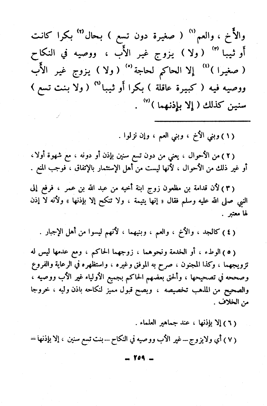 (¬7) أي ولا يزوج - غير الأب ووصيه في النكاح - بنت تسع سنين، إلا بإذنها عند جماهير العلماء، ويزوج المجنونة مع شهوتها كل ولي، الأقرب فالأقرب، لحاجتها إلى النكاح وصيانتها، وغير ذلك، وتعرف شهوتها من كلامها، وتتبعها الرجال.