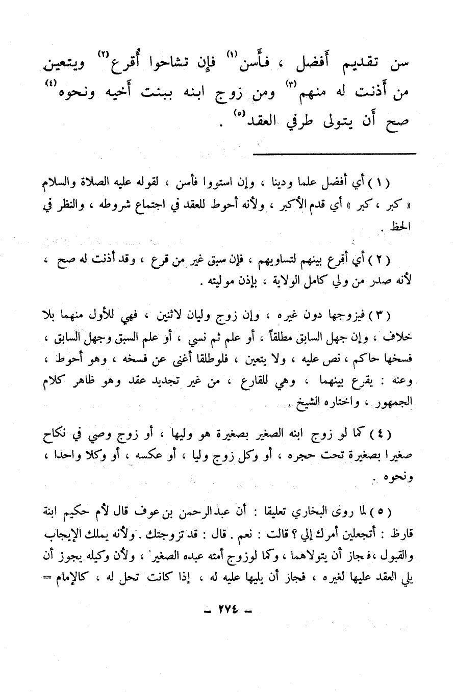 سن تقديم أَفضل، فأَسن (¬1) فإِن تشاحوا أُقرع (¬2) ويتعين من أَذنت له منهم (¬3) ومن زوج ابنه ببنت أَخيه ونحوه (¬4) صح أَن يتولي طرفي العقد (¬5) .