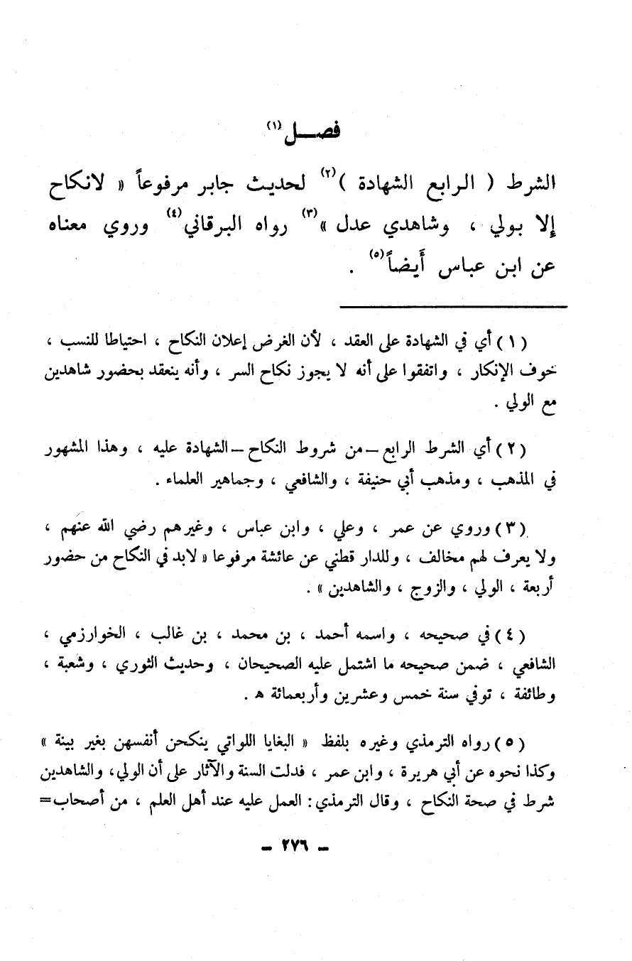 الشرط (الرابع الشهادة) (¬2) لحديث جابر مرفوعًا: «لا نكاح إِلا بولي، وشاهدي عدل» (¬3) رواه البرقاني (¬4) وروي معناه عن ابن عباس أَيضًا (¬5) .