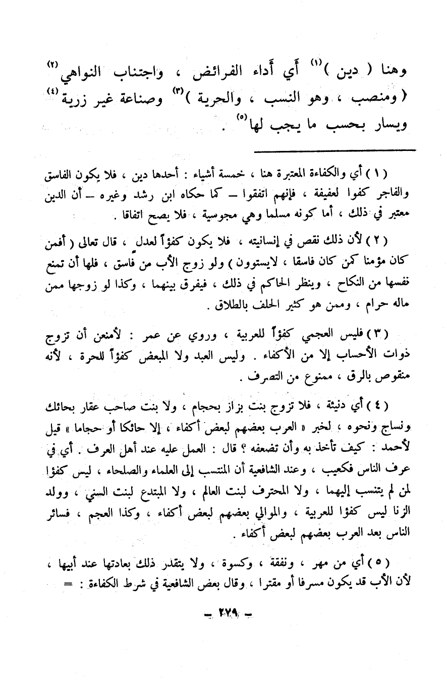 (¬1) أي والكفاءة المعتبرة هنا، خمسة أشياء: أحدها دين، فلا يكون الفاسق والفاجر كفوا لعفيفة، فإنهم اتفقوا - كما حكاه ابن رشد وغيره - أن الدين معتبر في ذلك، أما كونه مسلما وهي مجوسية، فلا يصح اتفاقا.