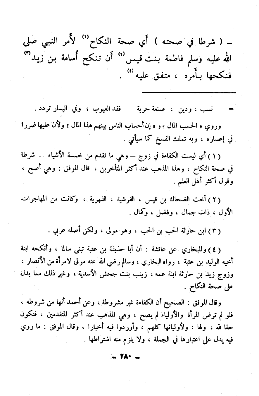 وقال الوفق: الصحيح أن الكفاءة غير مشروطة، وعن أحمد أنها من شروطه، فلو لم ترض المرأة والأولياء لم يصح، وهي المذهب عند أكثر المتقدمين، فتكون حقا لله، ولها، ولأوليائها كلهم، وأوردوا فيه أخبارا، وقال الموفق: ما روي فيد يدل على اعتبارها في الجملة، ولا يلزم منه اشتراطها.