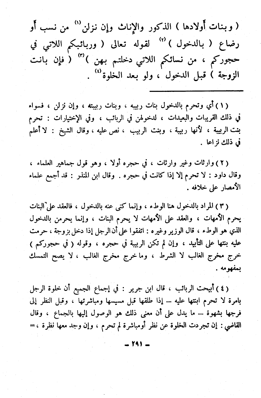 (¬4) أبيحت الربائب، قال ابن جرير: في إجماع الجميع أن خلوة الرجل بامرأة لا تحرم ابنتها عليه - إذا طلقها قبل مسيسها ومباشرتها، وقبل النظر إلى فرجها بشهوة - ما يدل على أن معنى ذلك هو الوصول إليها بالجماع، وقال القاضى: إن تجردت الخلوة عن نظر أو مباشرة لم تحرم، وإن وجد معها نظرة،