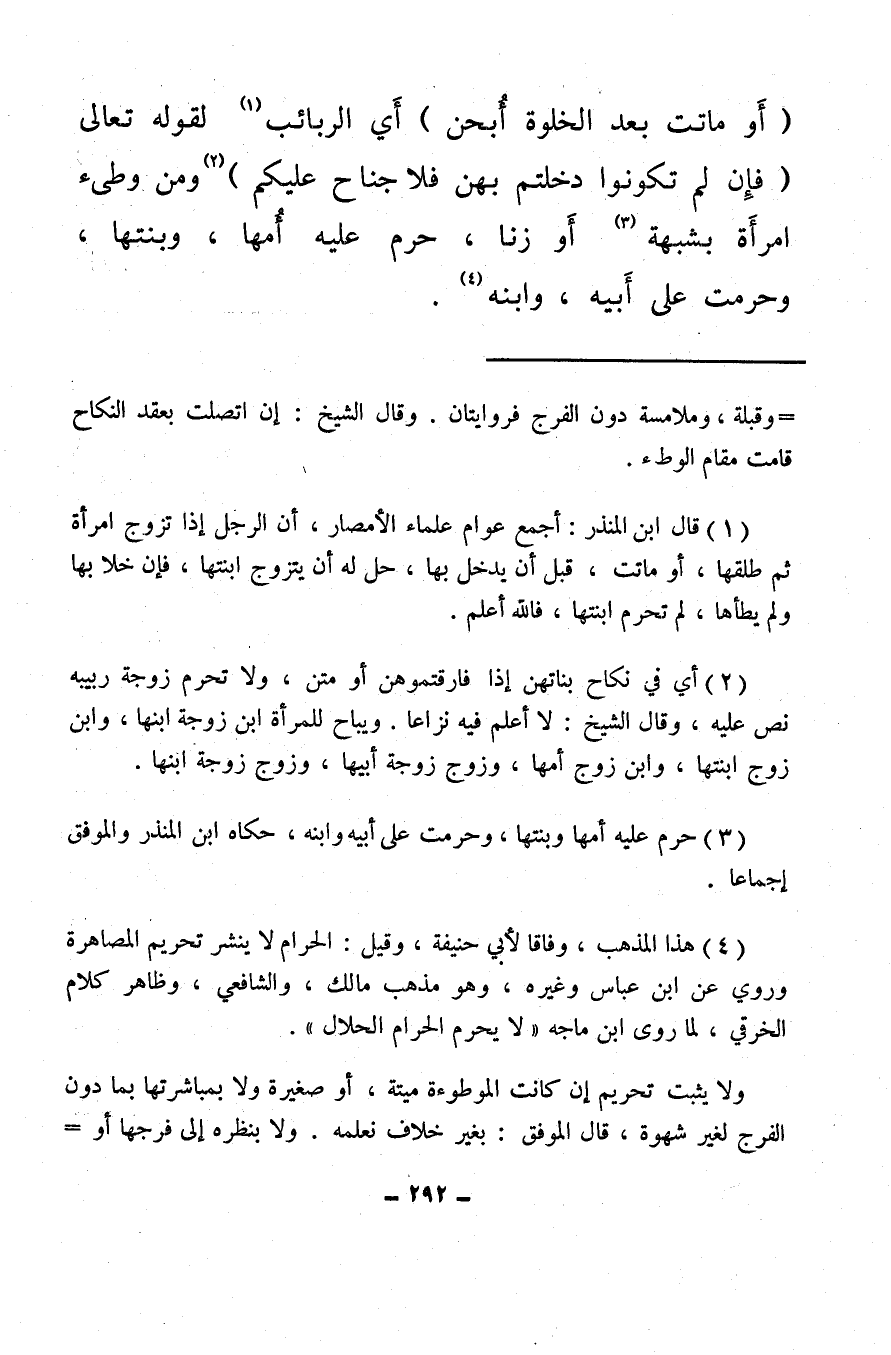 (أَو ماتت بعد الخلوة أُبحن) أي الربائب (¬1) لقوله تعالى (فإِن لم تكونوا دخلتم بهن فلا جناح عليكم) (¬2) ومن وطئ امرأة بشبهة (¬3) أَو زنا، حرم عليه أُمها، وبنتها، وحرمت على أَبيه، وابنه (¬4) .