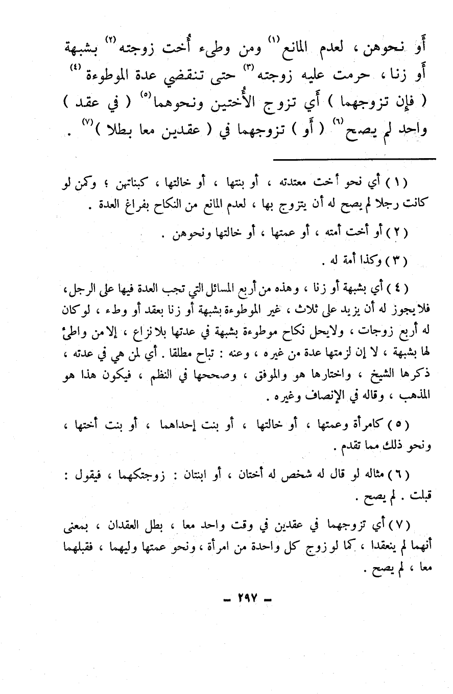 (¬4) أي بشبهة أو زنا، وهذه من أربع المسائل التي تجب العدة فيها على الرجل، فلا يجوز له أن يزيد على ثلاث، غير الموطوءة بشبهة أو زنا بعقد أو وطء، لو كان له أربع زوجات، ولا يحل نكاح موطوءة بشبهة في عدتها بلا نزاع، إلا من واطئ لها بشبهة، لا إن لزمتها عدة من غيره، وعنه: تباح مطلقا. أي لمن هي في عدته، ذكرها الشيخ، واختارها هو والموفق، وصححها في النظم، فيكون هذا هو المذهب، وقاله في الإنصاف وغيره.