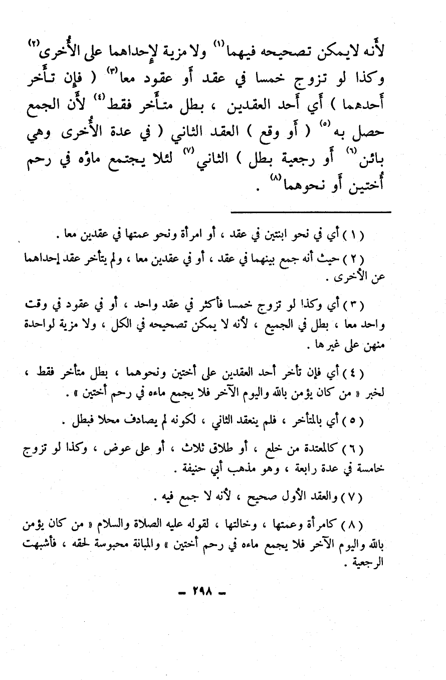 (¬3) أي وكذا لو تزوج خمسا فأكثر في عقد واحد، أو في عقود في وقت واحد معا، بطل في الجميع، لأنه لا يمكن تصحيحه في الكل، ولا مزية لواحدة منهن على غيرها.