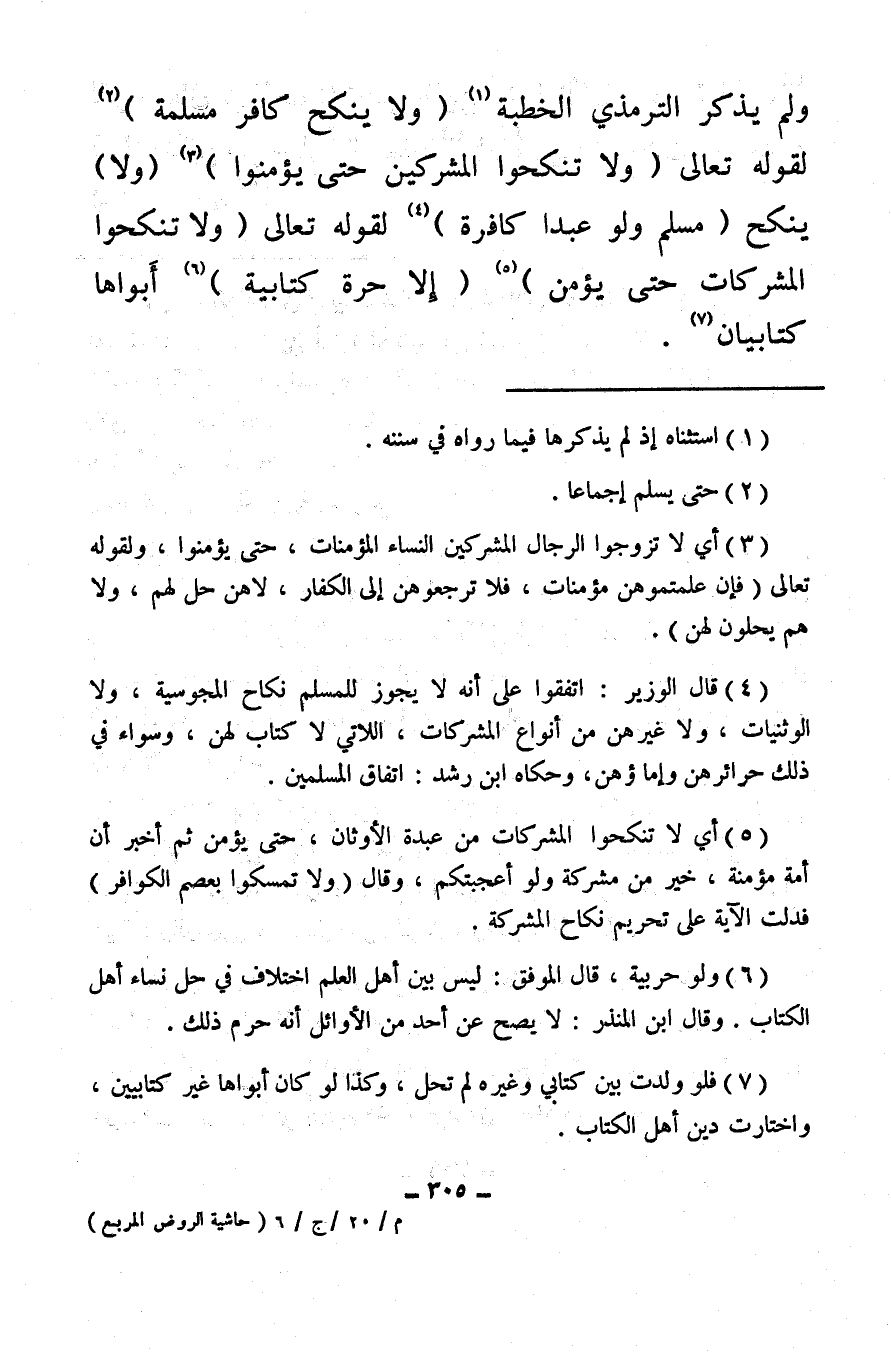 ولم يذكر الترمذي الخطبة (¬1) (ولا ينكح كافر مسلمة) (¬2) لقوله تعالى {وَلا تُنْكِحُوا الْمُشْرِكِينَ حَتَّى يُؤْمِنُوا} (¬3) (ولا) ينكح (مسلم ولو عبدًا كافرة) (¬4) لقوله تعالى {وَلا تَنْكِحُوا الْمُشْرِكَاتِ حَتَّى يُؤْمِنَّ} (¬5) (إلا حرة كتابية) (¬6) أبواها كتابيان (¬7) .