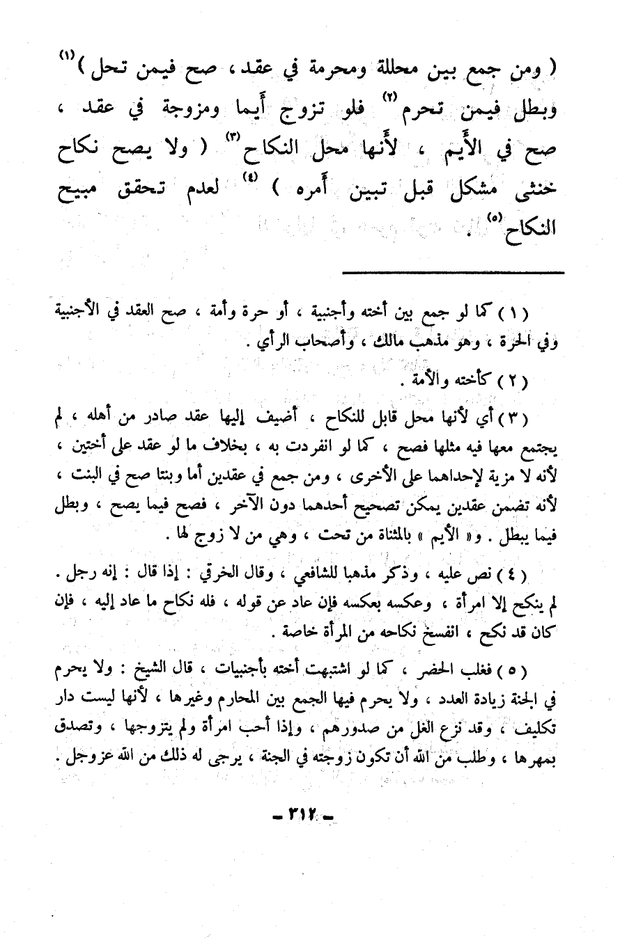 (ومن جمع بين محللة ومحرمة في عقد، صح فيمن تحل) (¬1) وبطل فيمن تحرم (¬2) فلو تزوج أيمًا ومزوجة في عقد، صح في الأَيم، لأنها محل النكاح (¬3) (ولا يصح نكاح خنثى مشكل قبل تبين أمره) (¬4) لعدم تحقق مبيح النكاح (¬5) .