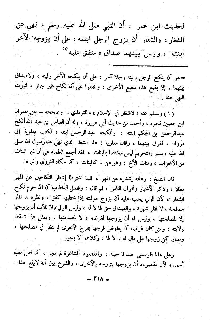 (¬1) ولمسلم عنه «لا شغار في الإسلام» وللترمذي – وصححه – عن عمران بن حصين نحوه، وأحمد من حديث أبي هريرة، وله أن العباس بن عبد الله أنكح عبد الرحمن بن الحكم ابنته، وأنكحه عبد الرحمن ابنته، فكتب معاوية إلى مروان، ففرق بينهما، وقال معاوية: هذا الشغار الذي نهى عنه رسول الله صلى الله عليه وسلم والتحريم ليس مختصا بالبنات، فقد أجمع العلماء على أن غير البنات من الأخوات، وبنات الأخ، وغيرهن، كالبنات، كما حكاه النووي وغيره.
