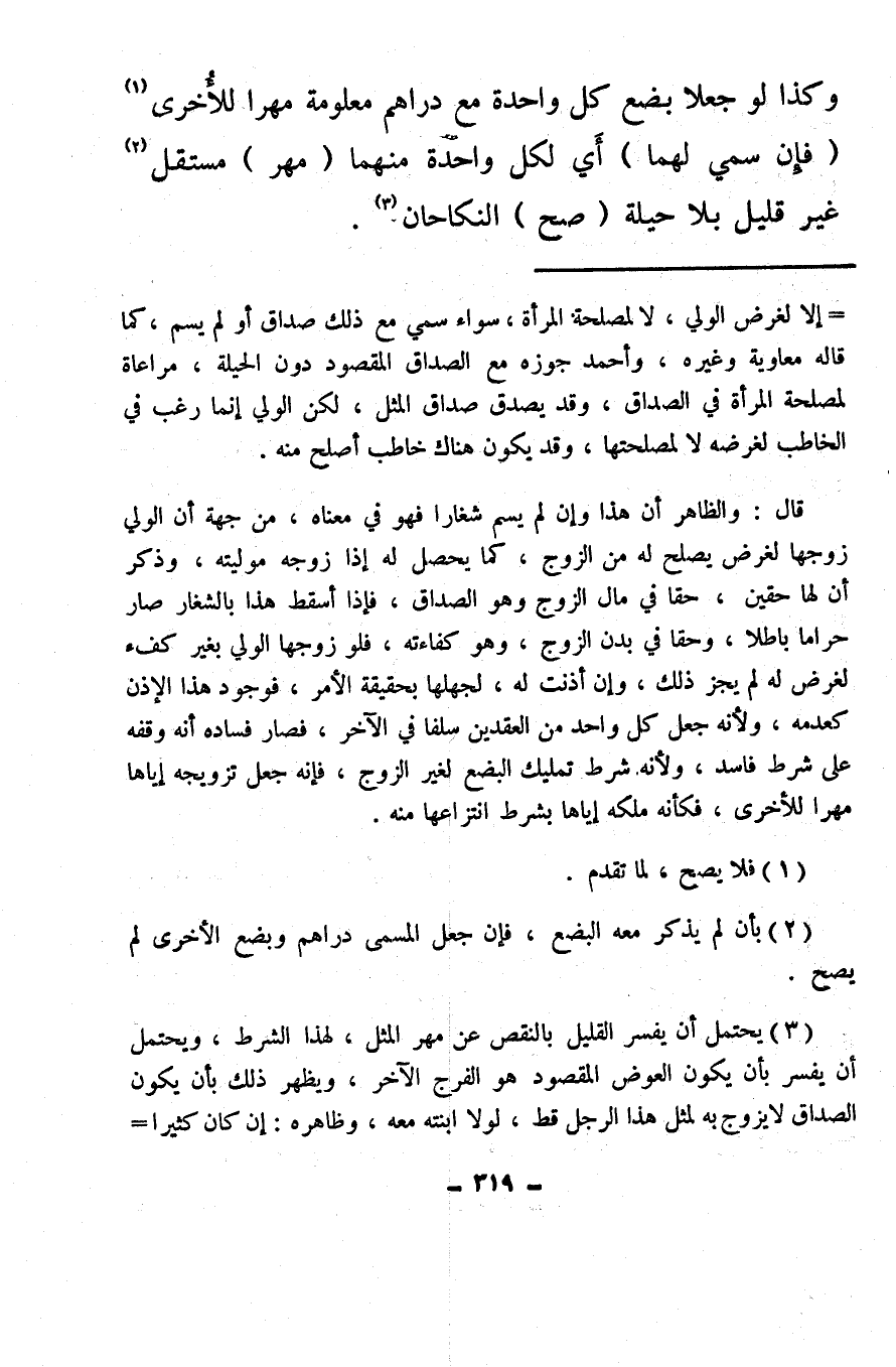 (¬3) يحتمل أن يفسر القليل بالنقص عن مهر المثل، لهذا الشرط، ويحتمل أن يفسر بأن يكون العوض المقصود هو الفرج الآخر، ويظهر ذلك بأن يكون الصداق لا يزوج به لمثل هذا الرجل قط، لولا ابنته معه، وظاهره: إن كان كثيرًا