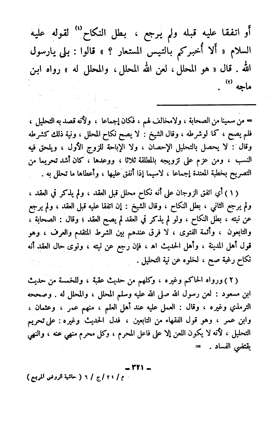 (¬2) ورواه الحاكم وغيره، وكلهم من حديث عقبة، وللخمسة من حديث ابن مسعود: لعن رسول الله صلى الله عليه وسلم المحلل، والمحلل له. وصححه الترمذي وغيره، وقال: العمل عليه عند أهل العلم، منهم عمر، وعثمان، وابن عمر، وهو قول الفقهاء من التابعين، فدل الحديث وغيره: على تحريم التحليل، لأنه لا يكون اللعن إلا على فاعل المحرم، وكل محرم منهي عنه، والنهي يقتضي الفساد.