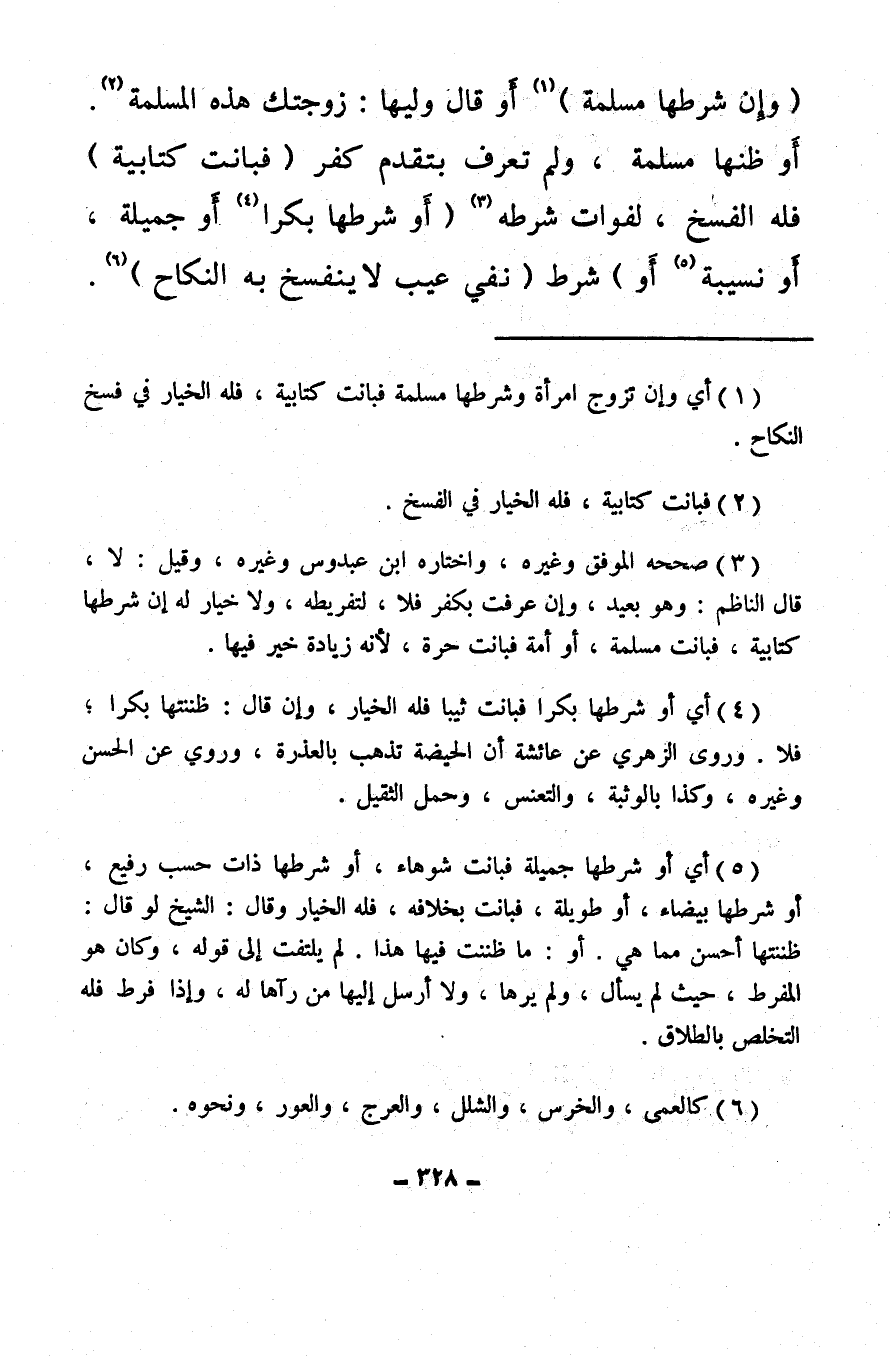 (¬5) أي أو شرطها فبانت شوهاء، أو شرطها ذات حسب رفيع، أو شرطها بيضاء، أو طويلة، فبانت بخلافه، فله الخيار وقال: الشيخ لو قال: ظننتها أحسن مما هي. أو: ما ظننت فيها هذا. لم يلتفت إلى قوله، وكان هو المفرط، حيث لم يسأل، ولم يرها، ولا أرسل إليها من رآها له، وإذا فرط فله التخلص بالطلاق.