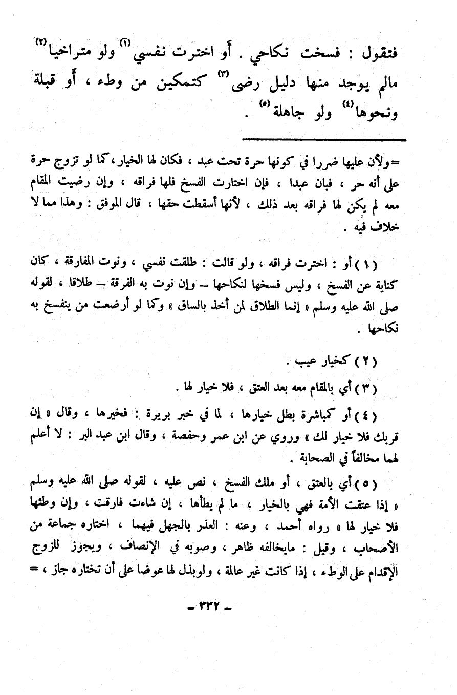 (¬5) أي بالعتق، أو ملك الفسخ، نص عليه، لقوله صلى الله عليه وسلم «إذا عتقت الأَمة فهي بالخيار، ما لم يطأها، إن شاءت فارقت، وإن وطئها فلا خيار لها» رواه أحمد، وعنه: العذر بالجهل فيهما، اختاره جماعة من الأصحاب، وقيل: ما يخالفه ظاهر، وصوبه في الإنصاف، ويجوز للزوج الإقدام على الوطء، إذا كانت غير عالمة، ولو بذل لها عوضا على أن تختاره جاز،