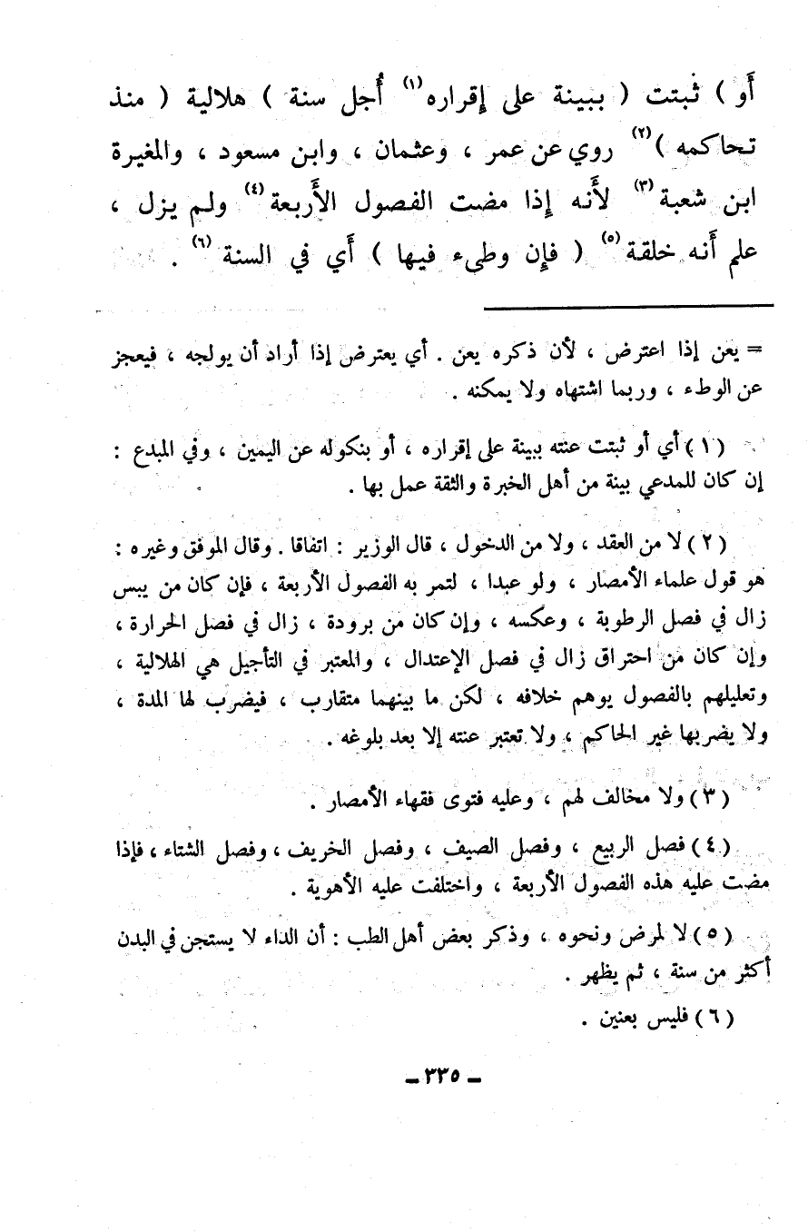 (¬2) لا من العقد، ولا من الدخول، قال الوزير: اتفاقا. وقال الموفق وغيره: هو قول علماء الأمصار، ولو عبدا، لتمر به الفصول الأربعة، فإن كان من يبس زال في فصل الرطوبة، وعكسه، وإن كان من برودة، زال في فصل الحرارة، وإن كان من احتراق زال في فصل الإعتدال، والمعتبر في التأجيل هي الهلالية، وتعليلهم بالفصول يوهم خلافه، لكن ما بينهما متقارب، فيضرب لها المدة، ولا يضربها غير الحاكم، ولا تعتبر عنته إلا بعد بلوغه.