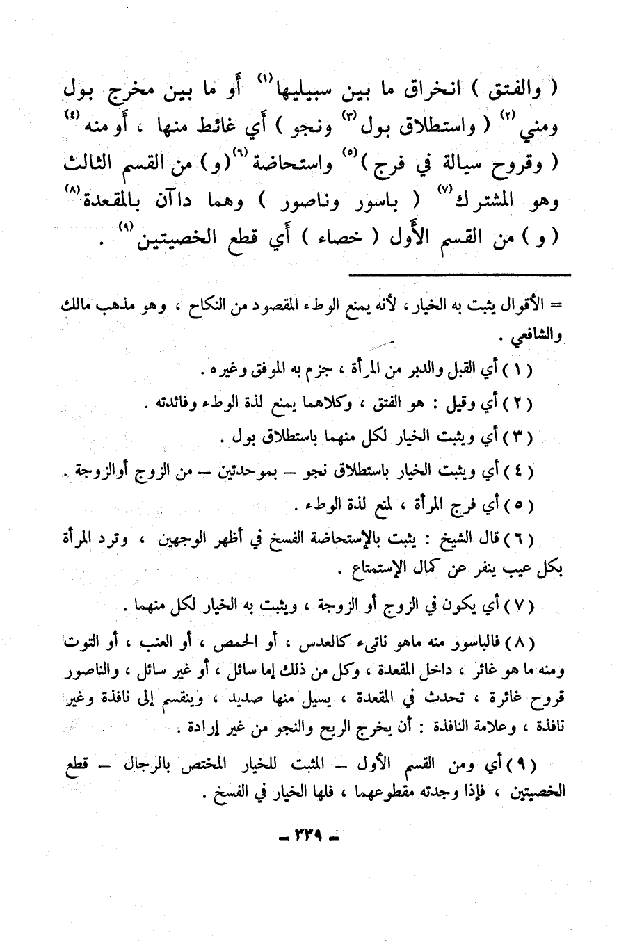 (والفتق) انخراق ما بين سبيليها (¬1) أو ما بين مخرج بول ومني (¬2) (واستطلاق بول (¬3) ونجو) أي غائط منها، أو منه (¬4) (وقروح سيالة في فرج) (¬5) واستحاضة (¬6) (و) من القسم الثالث وهو المشترك (¬7) (باسور وناصور) وهما داآن بالمقعدة (¬8) (و) من القسم الأول (خصاء) أي قطع الخصيتين (¬9) .